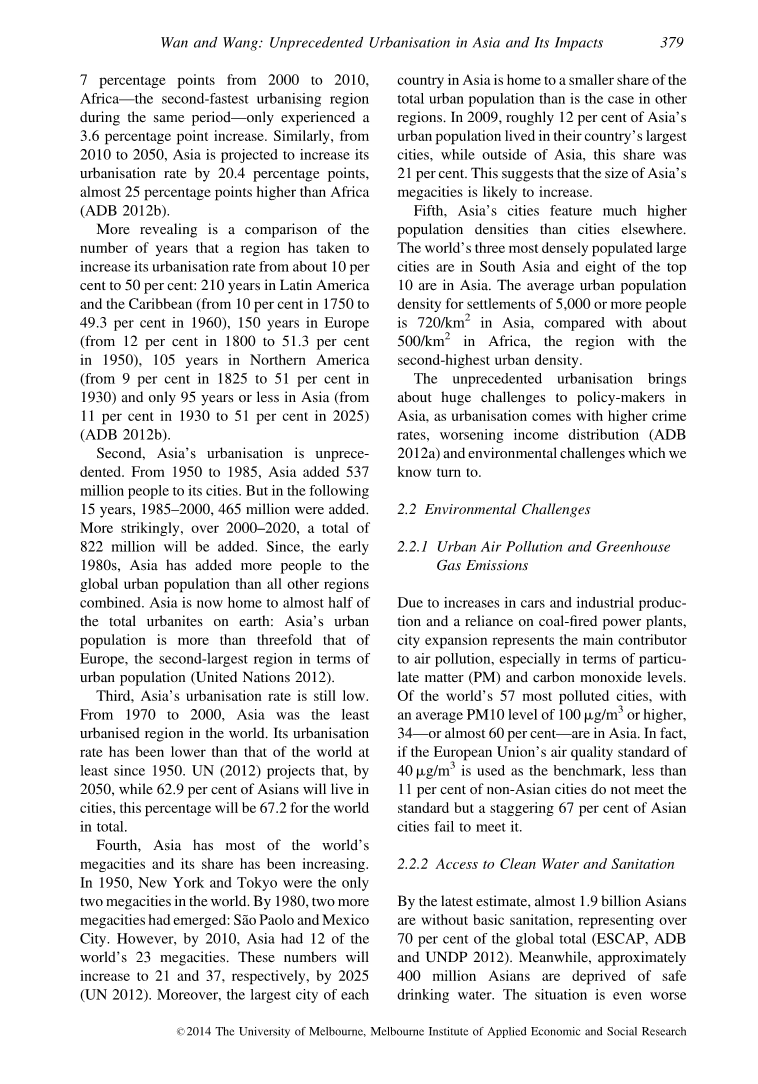 亚洲史无前例的城市化给2010年的决策者带来了巨大的挑战,随着城市化的发展带来更高的犯罪率、收入分配恶化(ADB 2012a) 以及我们所知的环境挑战。
