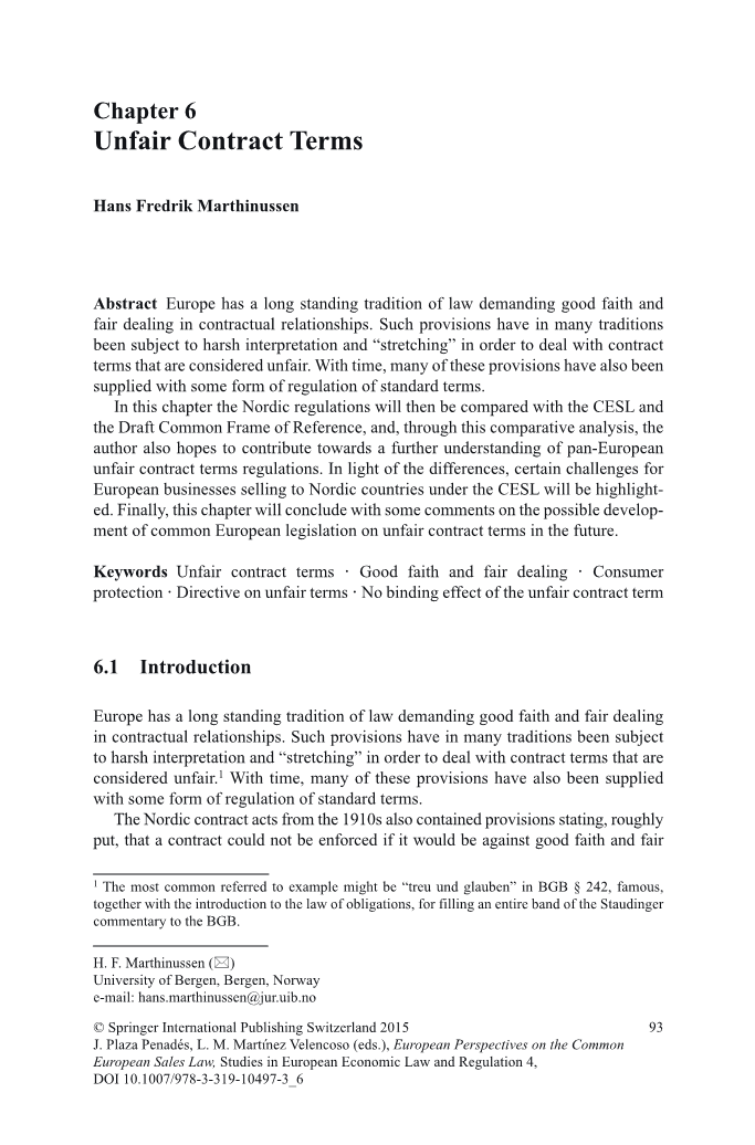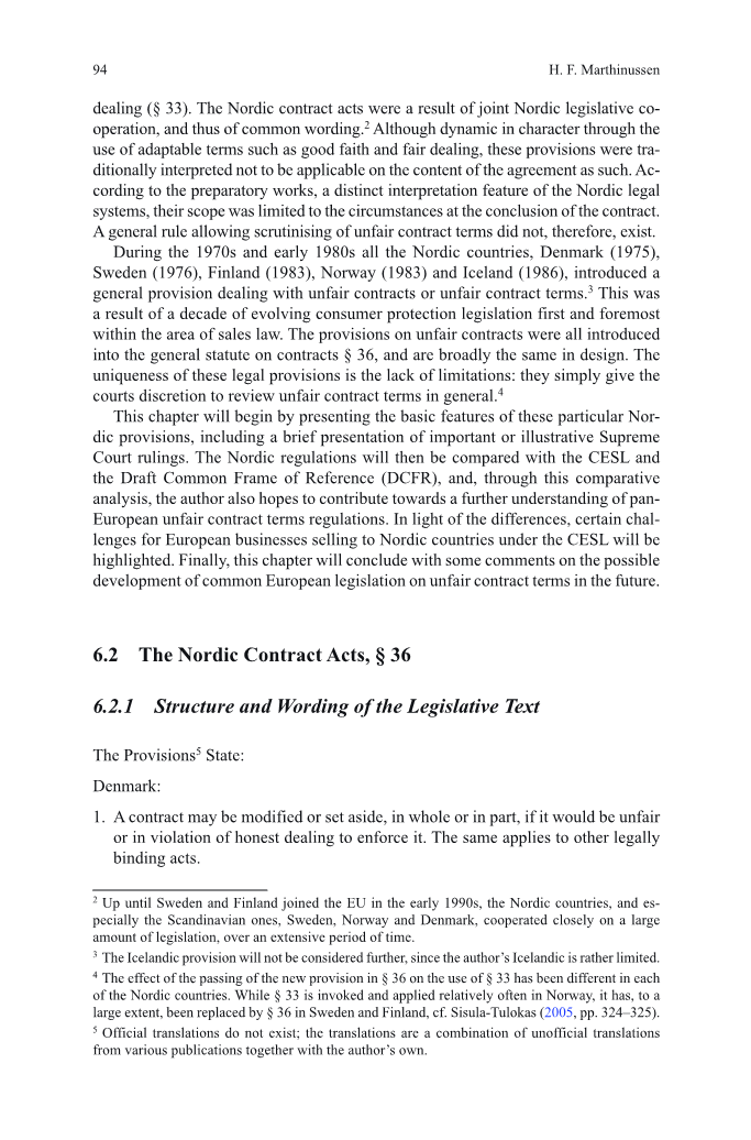 在20世纪70年代和80年代初,所有北欧国家,丹麦(1975年)、瑞典(1976年)、芬兰(1983年)、挪威(1983年)和冰岛(1986年),都引入了一项关于不公平合同或不公平合同条款的一般规定。【2】这是十年来消费者保护立法发展的结果,已经成为买卖法中首要的部分。关于不公平合同的规定都被引入了《合同通则》第36条。这些法律条款的独特之处在于没有什么限制条件:它们只是赋予法院一般审查不公平合同条款的自由裁量权。