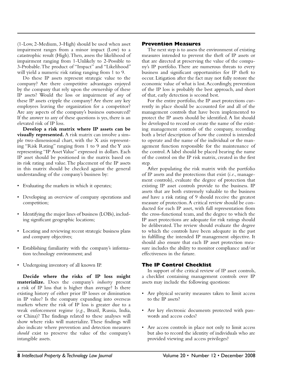 Categorize and quantify the risks. For each of the IP assets, determine the impact to the companyrsquo;s operating results if the asset were impaired ( i.e., misappropriated, infringed, or non-infringing alternatives introduced). A three-tiered impact rating (1-Low, 2-Medium, 3-High) should be used when asset impairment ranges from a minor impact (Low) to a catastrophic result (High).Then, assess the likelihood of impairment ranging from 1-Unlikely to 2-Possible to 3-Probable. The product of “Impact” and “Likelihood” will yield a numeric risk rating ranging from 1 to 9.