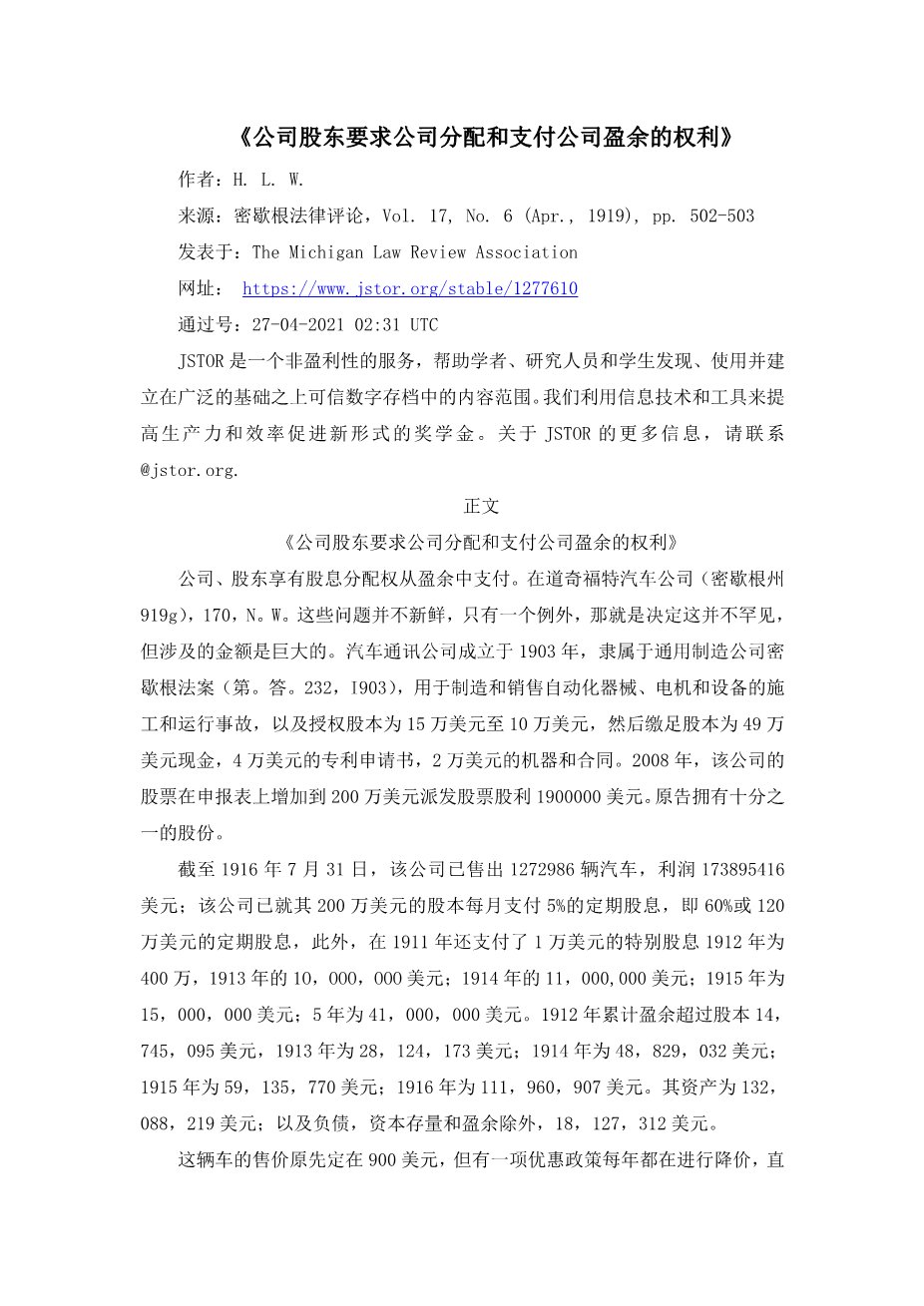 公司股东要求分配和支付公司盈余的权利外文翻译资料 2022-08-02 14:46:02 英语原文共 3 页,剩余内容已隐藏,支付完成后下载完整资料 英语译文共 3 页,剩余内容已隐藏,支付完成后下载完整资料 资料编号:[267302],资料为PDF文档或Word文档,PDF文档可免费转换为Word 原文和译文剩余内容已隐藏,您需要先支付 30元 才能查看原文和译文全部内容!立即支付 发小红书推广免费获取该资料资格。点击链接进入获取推广文案即可: Ai一键组稿 | 降AI率 | 降重复率 | 论文一键排版 PREVIOUS NEXT 您可能感兴趣的文章 试论消费者网购后悔权制度外文翻译资料 试论安全保障义务人补充责任外文翻译资料 论孤儿作品利用制度的完善外文翻译资料 租赁合同的历史外文翻译资料 区块链时代的电子证据:关于真实性和完整性的新规则外文翻译资料 辩诉交易、自白和刑事案件的协商解决外文翻译资料 云计算系统中的数字证据外文翻译资料 处于十字路口的英国法律援助系统外文翻译资料 案例分析 法学基础框架模型之错案责任调查制度外文翻译资料 谈判可以改变行政程序吗?外文翻译资料