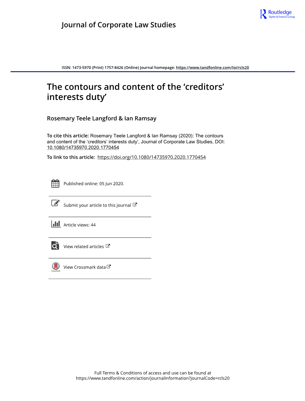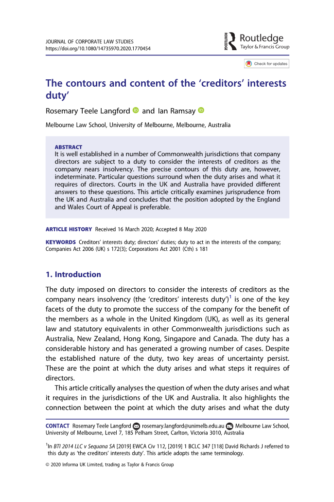 关键词:债权人利益责任;董事职责;为公司利益行事的责任;2006年公司法(英国)第172条(3);2001年公司法(Cth)第181条