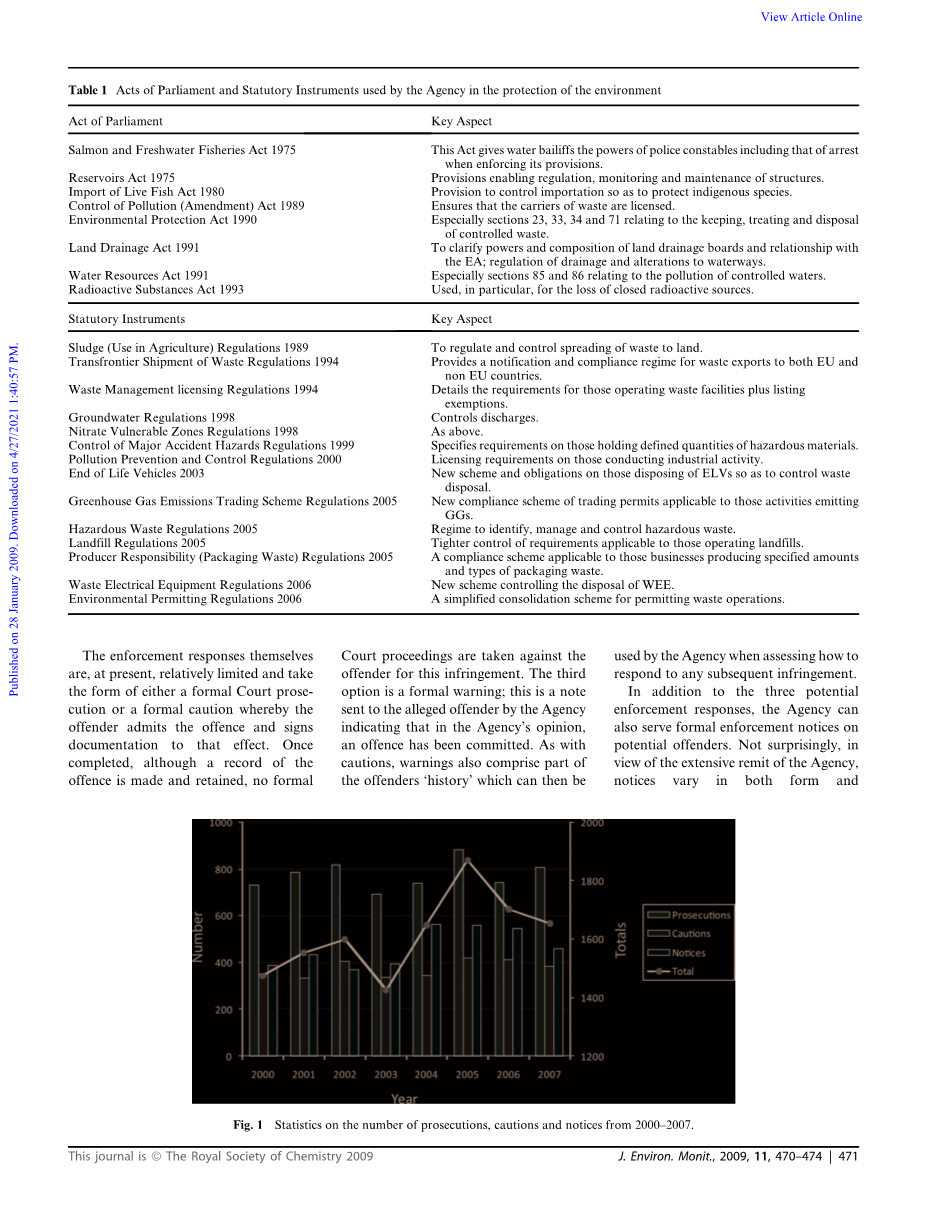 在英国,环境署负责执行环境立法并且打击根据这些法律和条例实施的犯罪。在现行制度下,如果情况严重,违规者将会被送交法庭。在过去八年中,每年约有1600起案件(包括约800起起诉),其中61%涉及非法处置废物,另有26%涉及水污染事件。而罚款数额则相对较小,每件污水罪罚款约为6700英镑,而废物罪的罚款约为3700英镑。这可能是由于法院对环境犯罪中所造成的损害缺乏认识。以2008年《监管执法和制裁法》为形式的新立法可能会改变该局对犯罪行为的评估和处理方式,其中一部分案件将由该局本身处理,而上诉由法庭处理,只有最严重的案件提交刑事法院。这一方法的有效性尚未在英国进行测试,但可能会加快这一进程,并导致更适当的制裁。