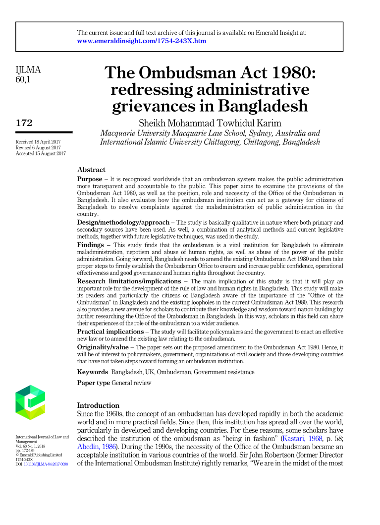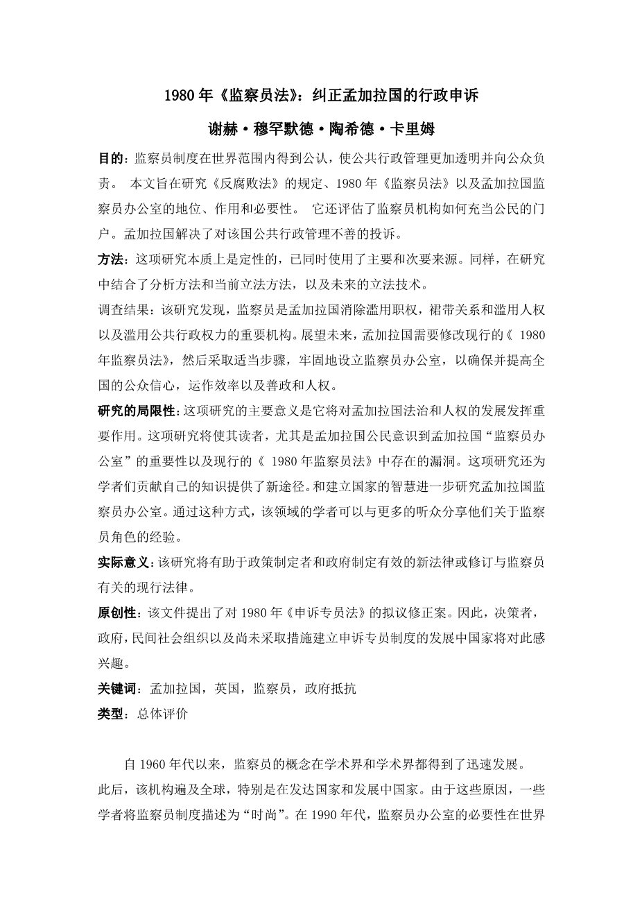 1980年《监察员法》:纠正孟加拉国的行政申诉外文翻译资料 2022-08-02 14:55:17 英语原文共 13 页,剩余内容已隐藏,支付完成后下载完整资料 英语译文共 10 页,剩余内容已隐藏,支付完成后下载完整资料 资料编号:[267260],资料为PDF文档或Word文档,PDF文档可免费转换为Word 原文和译文剩余内容已隐藏,您需要先支付 30元 才能查看原文和译文全部内容!立即支付 发小红书推广免费获取该资料资格。点击链接进入获取推广文案即可: Ai一键组稿 | 降AI率 | 降重复率 | 论文一键排版 PREVIOUS NEXT 您可能感兴趣的文章 试论消费者网购后悔权制度外文翻译资料 试论安全保障义务人补充责任外文翻译资料 论孤儿作品利用制度的完善外文翻译资料 租赁合同的历史外文翻译资料 区块链时代的电子证据:关于真实性和完整性的新规则外文翻译资料 辩诉交易、自白和刑事案件的协商解决外文翻译资料 云计算系统中的数字证据外文翻译资料 处于十字路口的英国法律援助系统外文翻译资料 案例分析 法学基础框架模型之错案责任调查制度外文翻译资料 谈判可以改变行政程序吗?外文翻译资料