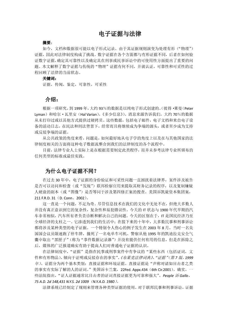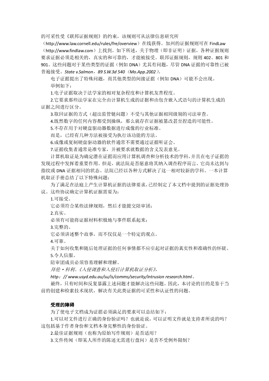 电子证据与法律外文翻译资料 2022-08-02 15:07:11 英语原文共 14 页,剩余内容已隐藏,支付完成后下载完整资料 英语译文共 9 页,剩余内容已隐藏,支付完成后下载完整资料 资料编号:[267153],资料为PDF文档或Word文档,PDF文档可免费转换为Word 原文和译文剩余内容已隐藏,您需要先支付 30元 才能查看原文和译文全部内容!立即支付 发小红书推广免费获取该资料资格。点击链接进入获取推广文案即可: Ai一键组稿 | 降AI率 | 降重复率 | 论文一键排版 PREVIOUS NEXT 您可能感兴趣的文章 试论消费者网购后悔权制度外文翻译资料 试论安全保障义务人补充责任外文翻译资料 论孤儿作品利用制度的完善外文翻译资料 租赁合同的历史外文翻译资料 区块链时代的电子证据:关于真实性和完整性的新规则外文翻译资料 辩诉交易、自白和刑事案件的协商解决外文翻译资料 云计算系统中的数字证据外文翻译资料 处于十字路口的英国法律援助系统外文翻译资料 案例分析 法学基础框架模型之错案责任调查制度外文翻译资料 谈判可以改变行政程序吗?外文翻译资料