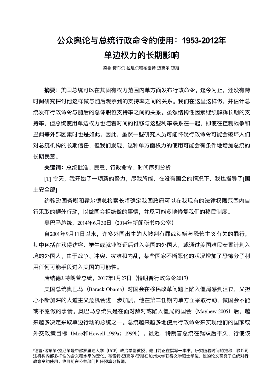 Frustrated with a deadlocked Congress on immigration reform, and fearing the further growth of an ever-deepening humanitarian crisis, U.S. president Barack Obama, well into his second term, acted unilaterally to do what Congress could not or would not do. President Obama is only one of many presidents who have increasingly decided to act unilaterally after facing a hostile or deadlocked Congress (Mayhew 2005). Presidents have increasingly used executive orders to achieve their national or foreign policy goals (Moe and Howell 1999a; 1999b). More recently, President Trump, soon after his inauguration, wielded the institutionrsquo;s executive order power to ban entry into the nation of persons traveling to the United States from majority-Muslim coun- tries, to distinctly mixed public reaction (Trump 2017). By using executive orders to circumvent Congress, presidents are able to use one of their many tools to act unilaterally.1