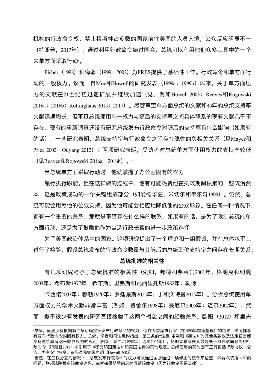 identrsquo;s general power of executive orders and unilateral action. Since Moe and Howellrsquo;s studies were published (1999a; 1999b), however, the literature on the unilateral pres- idency has expanded rapidly and continued to accelerate at the beginning of the twenty-first century (see, e.g., Howell 2003; Reeves and Rogowski 2016a; 2016b; Rottinghaus 2015; 2017). Despite the rapid growth of that literature examining the unilateral presidency, and 45 years of presidential approval ratings literature, the existing literature examining the specific link between the presidentrsquo;s use of unilat- eral powers and subsequent approval ratings is virtually nonexistent. Existing re- search has not examined what effect, if any, a presidentrsquo;s issuing of executive orders has on subsequent approval ratings. Some studies suggest an implicit negative rela- tionship between presidential approval ratings and executive orders (see Mayer and Price 2002; Ouyang 2012); two studies have demonstrated that survey respondents report lower approval ratings for the presidentrsquo;s unilateral power use (see Reeves and Rogowski 2016a; 2016b).2