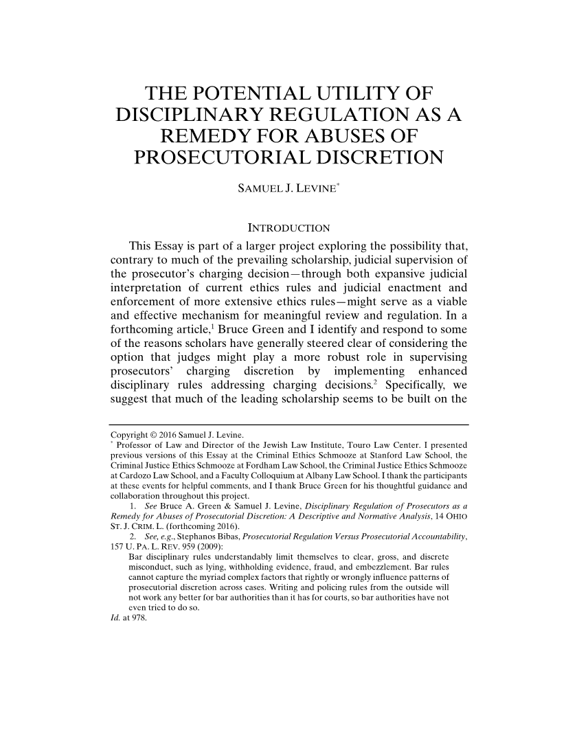 本论文是一个较大项目其中的一部分,旨在探讨以下可能性:与大多数现行观点相反,司法监督通过广泛的司法现行道德规范和司法法规的解释,以及实施更广泛的道德规范,来审查和监管检察官的指控决定,这可能是一个可行的机制。 在一篇即将发表的文章中,布鲁斯·格林和我指出了学者们通常不考虑法官可能发挥更有力作用的一些原因,并对此做出了回应。我们可以通过执行针对指控决定的纪律规则,监督检察官的指控酌处权。具体来说,我们建议许多学术观点应该建立在三权分立的前提下,法院缺少审查起诉决定的权威和能力。[1]但是,我们认为,许多学者几乎完全断定法院无权审查起诉决定,这反映了对联邦法律和联邦法院的过度关注,因此,这仅揭示了故事的一部分。