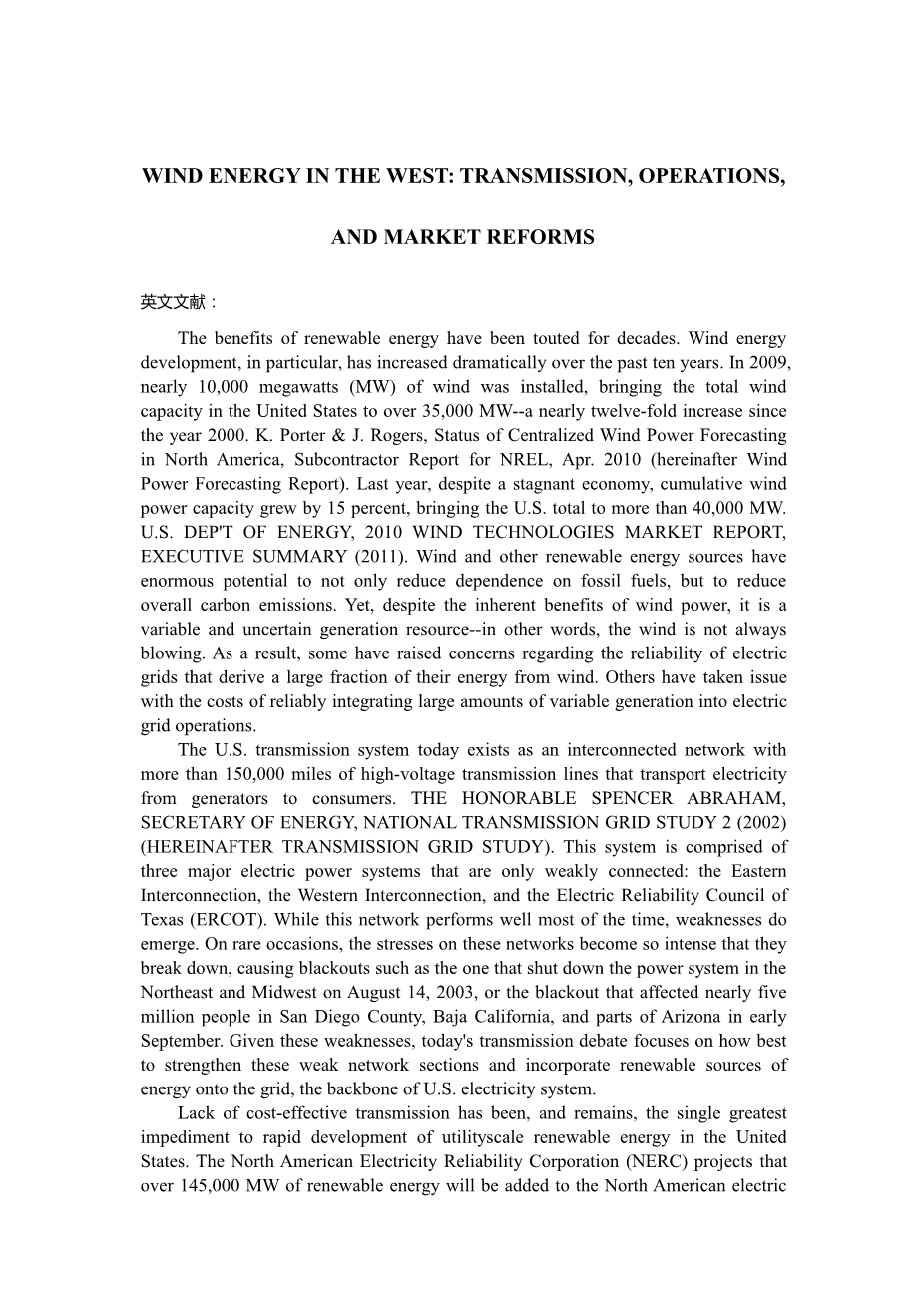 The benefits of renewable energy have been touted for decades. Wind energy development, in particular, has increased dramatically over the past ten years. In 2009, nearly 10,000 megawatts (MW) of wind was installed, bringing the total wind capacity in the United States to over 35,000 MW--a nearly twelve-fold increase since the year 2000. K. Porter amp; J. Rogers, Status of Centralized Wind Power Forecasting in North America, Subcontractor Report for NREL, Apr. 2010 (hereinafter Wind Power Forecasting Report). Last year, despite a stagnant economy, cumulative wind power capacity grew by 15 percent, bringing the U.S. total to more than 40,000 MW. U.S. DEPT OF ENERGY, 2010 WIND TECHNOLOGIES MARKET REPORT, EXECUTIVE SUMMARY (2011). Wind and other renewable energy sources have enormous potential to not only reduce dependence on fossil fuels, but to reduce overall carbon emissions. Yet, despite the inherent benefits of wind power, it is a variable and uncertain generation resource--in other words, the wind is not always blowing. As a result, some have raised concerns regarding the reliability of electric grids that derive a large fraction of their energy from wind. Others have taken issue with the costs of reliably integrating large amounts of variable generation into electric grid operations.