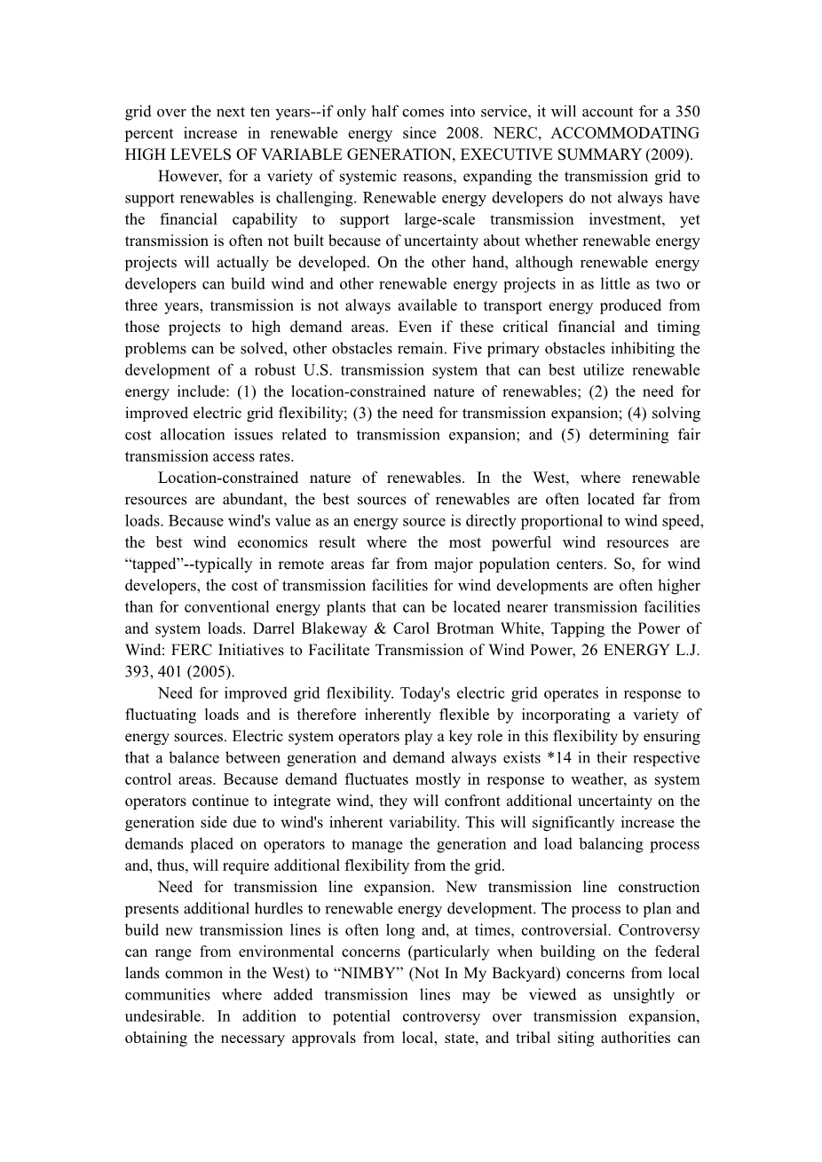 Lack of cost-effective transmission has been, and remains, the single greatest impediment to rapid development of utilityscale renewable energy in the United States. The North American Electricity Reliability Corporation (NERC) projects that over 145,000 MW of renewable energy will be added to the North American electric grid over the next ten years--if only half comes into service, it will account for a 350 percent increase in renewable energy since 2008. NERC, ACCOMMODATING HIGH LEVELS OF VARIABLE GENERATION, EXECUTIVE SUMMARY (2009).