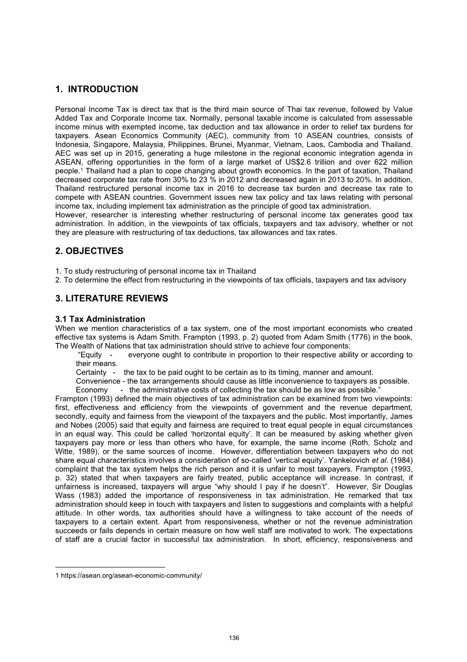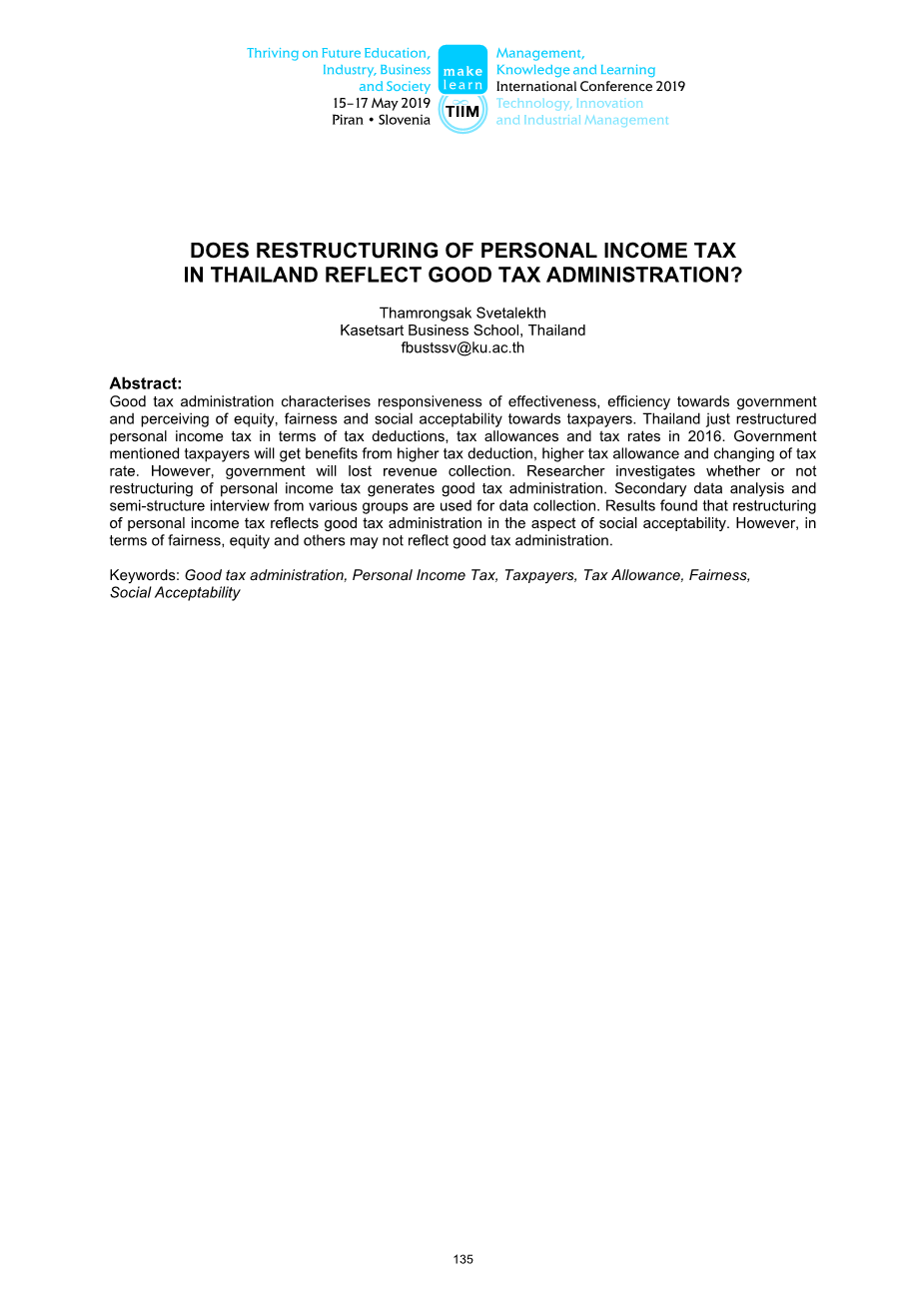 本文从利益相关者的角度研究了泰国个人所得税的重组如何影响纳税人,以及如何反映良好的税收管理。因此,研究者在本文中使用了两种研究方法。首先,对于原始数据,研究人员从对财政部3名税务专家,2份税务咨询人员和2名来自直接影响到重组的大型私营公司的纳税人的半结构化访谈中收集数据。 主要问题集中在对附加税扣除和免税额以及调整个人所得税的意见上税收重组的利率。第二,研究者从文献研究中收集数据,如财政部的数据、收入法、期刊、税务学术研究的数据,以研究个人所得税重组的影响。