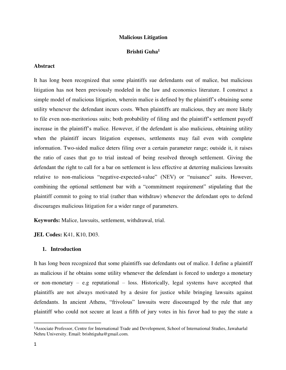 尽管古往今来的法律体系都承认处理恶意诉讼的重要性,但据我所知,恶意诉讼背后的法律和经济学原理,在之前的文献中从未出现过。我构建了一个简单的恶意诉讼模型,允许原告在被告遭受损失时获得恶意效用。我发现,与非恶意原告相比,恶意原告更有可能提起诉讼,并且能够获得更大的和解赔偿;原告的恶意中,申报概率和结算报酬均呈单调递增。如果被告也是恶意的,在获得一些效用时,原告不得不支付诉讼费用,和解可能会失败。如果双方都有足够的恶意,且原告的诉讼成本较高,则更有可能出现这种情况;然而,如果被告非常恶意,和解总是会失败。通过影响原告获取和解的能力,两面性恶意可以在一定范围内阻止恶意诉讼;另一方面,它也意味着,不受阻碍的诉讼进入审判,而不是通过和解解决,从而增加了诉讼与和解的比例。我将恶意诉讼与妨害诉讼区分开来,这表明,在阻止恶意诉讼(相对于妨害诉讼)方面,给予被告禁止和解的选择的效果较差。然而,将可选的和解条款与“承诺要求”相结合,如果被告提出辩护,则约束原告进行审判,效果更好。