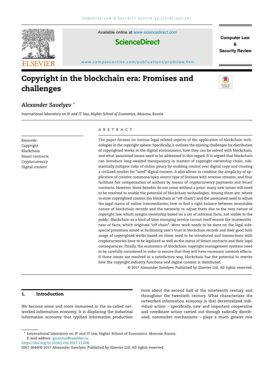 摘 要:本文关注区块链技术针对知识产权领域中法律问题的应用。具体来说,它概述了在数字环境为作品传播带来的挑战、如何使用区块链应对该问题以及哪些有关问题亟待解决。有人认为,区块链可以在版权所有权方面引入人们期待已久的透明度;通过对数字副本进行控制并为“使用过的”数字内容创建文明的市场,可以大大降低在线盗版的风险。它还允许将应用创意共享/开放源代码类型许可证的简便性与收入流相结合,从而通过加密货币支付和智能合约促进作者的公平补偿。但是,这些好处并非没有代价:必须解决许多新问题才能发挥区块链技术的潜力。其中包括:在何处存储受版权保护的内容(在区块链或“脱链”上)以及调整在线中介的法律地位的相关需求;由于版权法的本质,如何在区块链记录的不变性质与调整它们的必要性之间找到合适的平衡,该法基于一系列不公开的非正式事实来分配所有权。区块链作为一种时间戳服务,本身无法确保事实的可信度,这些事实源自“链外”。在法律方面还需要做更多的工作:需要引入旨在促进用户对区块链记录的信任以及基于信誉的诚实使用受版权保护的作品的特殊规定,并且必须使加密货币交易合法化,以及加密货币的地位。智能合约及其法律后果。最后,需要仔细考虑区块链版权管理系统的经济性,以确保它们将产生必要的网络效应。如果以令人满意的方式解决了这些问题,则区块链有可能重写版权行业的功能和数字内容的分发方式。