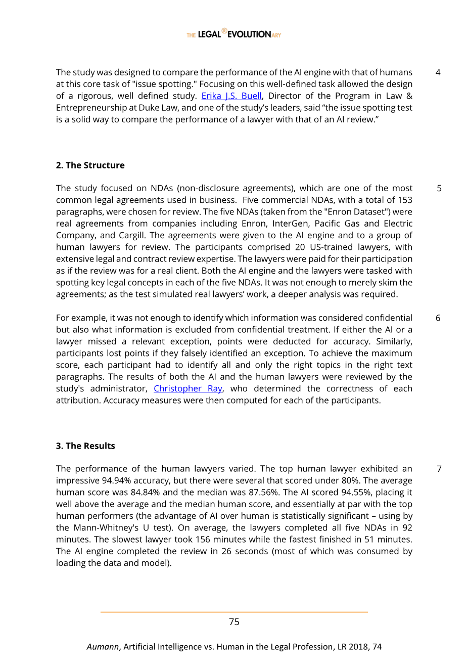 该研究旨在比较AI发动机与人类性能在这个核心任务的'问题发现.'专注于这个明确界定的任务,允许设计一个严格,明确的研究。杜克大学法律与创业项目主任、该研究的负责人之一Erika J.S. Buell表示,'发现问题测试是比较律师绩效与AI审查结果的可靠方法。