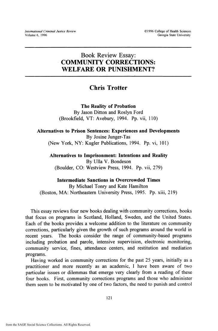 本文回顾了四本关于社区矫正的新书,这些书主要关注苏格兰、荷兰、瑞典和美国的社区矫正项目。每一本书都为社区矫正的文献提供了可喜的补充,特别是考虑到近年来世界各地此类项目的发展。这些书考虑了一系列以社区为基础的计划,包括缓刑和假释、强化监督、电子监控、社区服务、罚款、出勤中心以及归还和调解计划。