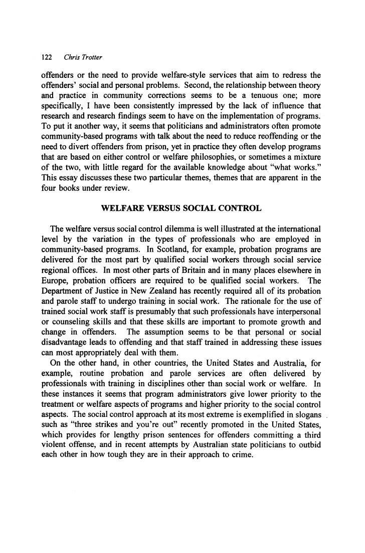 本书中介绍的苏格兰缓刑服务处于福利/社会控制连续体的福利末端。在苏格兰,地方当局通过普通社会工作部门提供缓刑服务。缓刑犯在社会工作者的监督下,社会工作者可能也有责任为儿童提供福利服务。提交人说,“我们生活在一个几乎一致同意的时代,即监狱人满为患,不起作用,是对可接受的人类监禁标准的侮辱,应该以其他方式对罪犯给予一切可能的支持”(第7页)。这种苏格兰式的福利取向似乎离“三次罢工”还有很长的一段路要走,而你的想法最近在美国已经传播开来了。