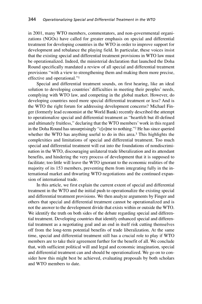 这一经历突出了在世界贸易组织磋商特殊与差别待遇时的两个关键困难。首先,在缺乏共同目标的情况下,发展中国家的提案可能会被削弱,以至于这些提案可能不会比现有的条款更有效或更具操作性。第二,发展中国家从特殊与差别待遇的进展中获得的整体利益可能会被他们为获得这些进展而被迫在其他领域作出的让步所抵消。这两个困难不应被视为反对实施特殊与差别待遇的论点,而是应视为反映了多边贸易谈判的固有特点,以及在实现特殊与差别待遇对发展中国家有意义时要克服的障碍。至少在一个观点上,我们不应该期望进行折衷,即实施特殊与差别待遇通常会对以前谈判的结果产生影响。
