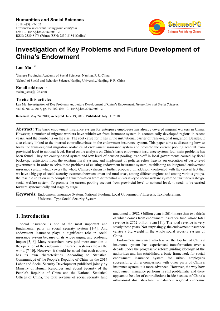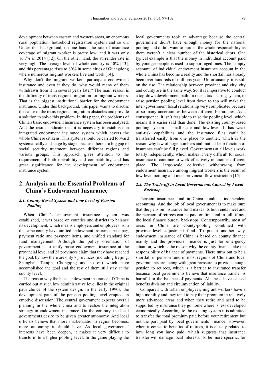 为什么农民工不参加养老保险,即使参加了,为什么很多人几年后就退出了养老保险?其主要原因是农民工跨地区流动的困难。这是养老保险最大的制度障碍。在此背景下,本文试图探讨跨区域移民障碍产生的原因,并提出解决这一问题的对策。本文对我国基本养老保险制度存在的问题进行了分析。结果表明,建立覆盖全体国民的综合养老保险制度是必要的。由于不同地区、不同群体的社会保障待遇存在较大差距,这一制度应逐步、系统地推进。该方法兼顾了可操作性和兼容性的要求,对养老保险制度的发展具有重要意义。
