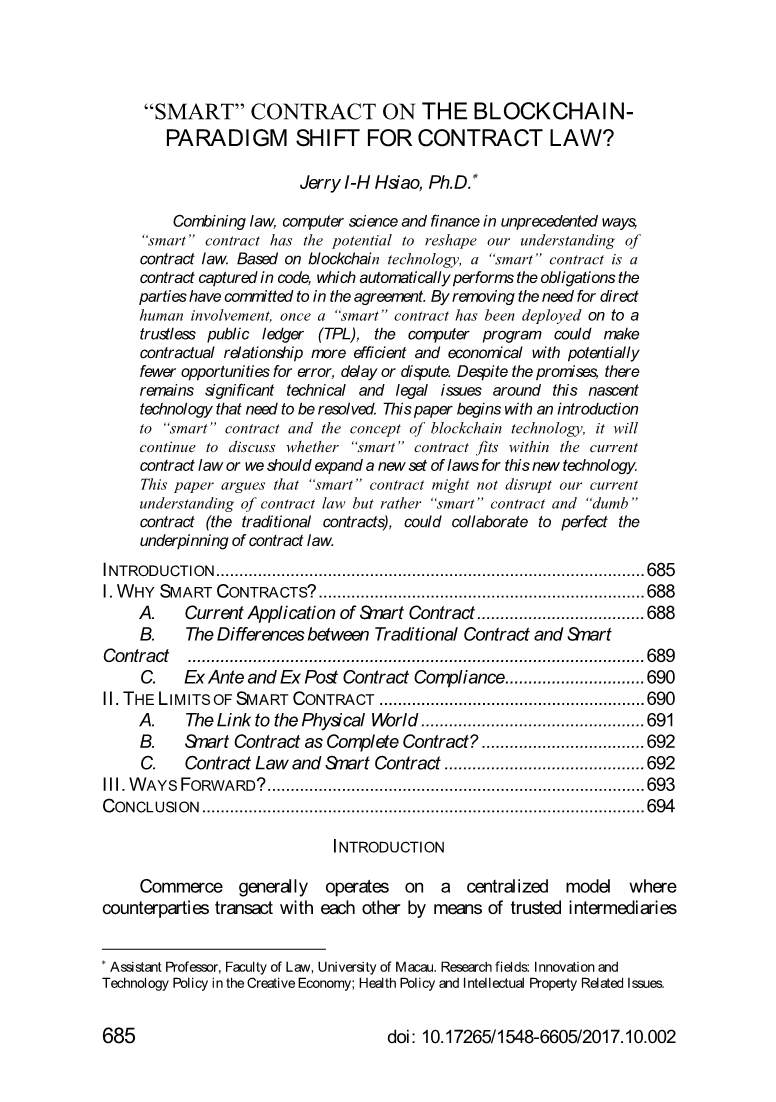 在围绕智能合约的所有炒作中,存在三个问题,需要对其进行评估,以查看智能合约是否带来了范式转向合同法。第一个是智能之间的区别合同和传统合同;二,ex之间有什么区别事前和事后合同的执行以及第三,合同法是否基于事前可适用于智能合约的