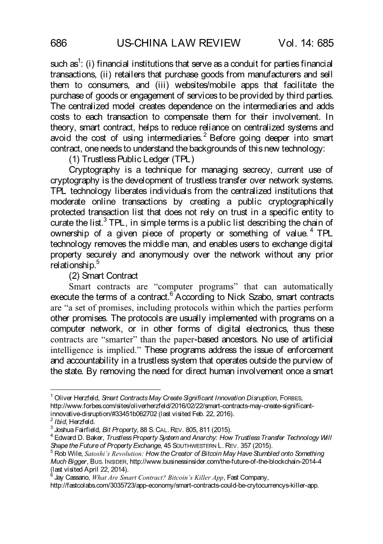 商业通常以集中化模式运作,交易对手之间通过可信中介进行交易,例如1:(i)充当交易方金融渠道的金融机构交易;(ii)从制造商那里购买商品并出售的零售商消费者;以及(iii)有助于购买商品或提供第三方提供的服务.集中式模型创建了对中介的依赖并增加了每笔交易的费用,以补偿他们的介入。在理论,智能合约,有助于减少对集中式系统的依赖避免使用中介的费用。在深入了解智能合同之前,需要了解这项新技术的背景:(1)不信任公共分类帐(TPL)密码术是一种管理秘密的技术,目前使用密码术是通过网络系统进行的无信任传输的发展。TPL技术将个人从集中机构中解放出来,通过以密码方式创建公众来管理在线交易不依赖特定实体信任的受保护交易列表然后整理清单简单来说,TPL是一个公开列表,描述了给定财产或价值的所有权。第三方物流技术消除了中间人,使用户可以交换数字通过网络安全匿名地获取财产关系(2)智能合约智能合约是可以自动执行的“计算机程序”,尼克·萨博(Nick Szabo)称,智能合约是执行合同的条款。是“一组承诺,包括各方履行的协议其他承诺。这些协议通常是通过计算机网络或其他形式的数字电子设备,因此这些合同比纸质祖先“更聪明”。不使用人工暗示着情报。”这些计划解决了执法问题和不负责任的系统中的问责制状态。一旦不再是通过人,就不需要人类直接参与合同已部署到分布式分类帐中,计算机程序可以使合同关系更加有效和经济的解决错误,误解,延误或争执。简而言之,智能合约的吸引力在于(1)通过执行的确定性获得信任,以及(2)创造效率通过消除中介机构及其带来的成本交易。智能合约的基本特征是:首先,智能合约是使用计算机上使用的源代码起草的,可以将它们标准化,并几乎免费执行,从而减少了边际成本承包。其次,当事方重视确定性,没有余地。合同解释不明确,但要执行合同。所以一旦缔约各方已同意受特定条款的约束,合同的代码将它们永久性地绑定到该条款。第三,智能合约是基于分散格式设计的。这些特性将在下文中进一步讨论(3)区块链尽管做出了承诺,但现实中智能合约仍然存在交易障碍。首先,智能合约如何实际控制真实资产,以便可以执行协议?其次,什么计算机将被信任以双方都可以“执行”这些条款的方式TPL协议依赖于分类账称为“区块链”,每个比特币的公开列表和分类账区块链无非是交易日志,而且每笔交易日志均通过一系列认证和验证。数学证明,几乎不可能双花或在交易中间拦截或重新安排付款。区块链技术代表了点对点的下一步经济。通过结合点对点网络,加密算法,分布式数据存储,以及分散的共识机制,提供了一种让人们就特定事务和记录达成共识的方式,该协议以安全且可验证的方式进行。 区块链以加密并组织成称为“块”的较小数据库。 每一块包含有关一定数量交易的信息,区块链中的前一个区块,以及复杂的答案数学难题,用于验证与之相关的数据块。 由于区块链始终保持同步,因此只有曾经有过所有权的真实记录,对防止任何人试图通过同时向多方发送资产来使资产花费双倍。因为一旦正确进行区块链编辑是不可能的,更新后,各方在数学上增强了对以下方面的信心:他们的所有权将持续到未来。