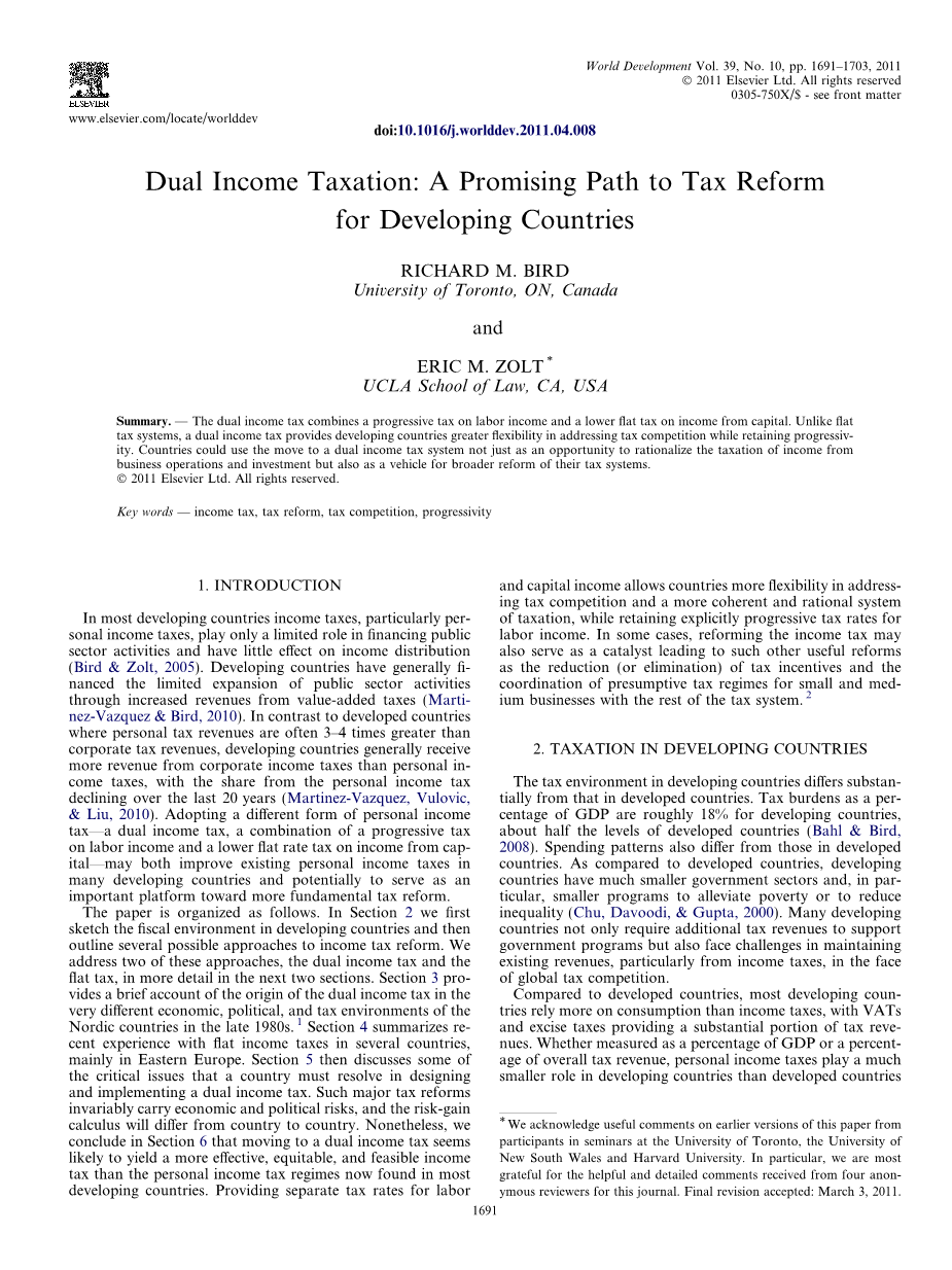 本文的论文的组织结构如下。在第二节中,我们首先概述了发展中国家的财政环境,然后概述了几种可能的所得税改革方法。我们将在接下来的两个部分中详细介绍其中的两种方法:二元所得税制和单一税制。第3节简要介绍了20世纪80年代末北欧国家在经济、政治和税收环境非常不同的情况下二元所得税的起源。【1】第4节总结了几个国家(主要是东欧)最近的统一所得税经验。第5节接着讨论了一个国家在设计和实施二元所得税时必须解决的一些关键问题。这种重大的税收改革必然会带来经济和政治风险,风险收益的计算也会因国家而异。尽管如此,我们在第6节中得出结论,与大多数发展中国家目前的个人所得税制度相比,改革为二元所得税似乎更有可能产生更有效、公平和可行的所得税制。为劳动力和资本收入提供单独的税率,使各国能够更灵活地应对税收竞争,建立更为连贯和合理的税收制度,同时明确保留对劳动力收入的累进税率。在某些情况下,所得税的改革也可能成为推动其他有益改革的催化剂,例如减少(或消除)税收激励措施,以及协调中小企业的推定税收制度与其他税收制度。【2】