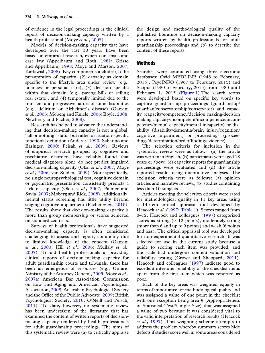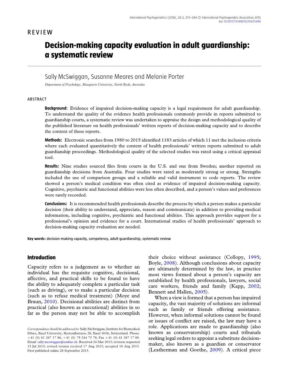 对卫生专业人员的调查表明,通常由于对这一概念的了解有限,通常认为决策能力难以评估和报告(Ganzini等人,2003年;Hill等人,2006年;Mullaly等人,2007年)。为帮助卫生专业人员为成年人监护法院和法庭提供决策能力的临床报告,出现了资源的出现(例如,安大略省总检察长部,2005年;莫邪等人,2007年a;美国律师协会法律和老龄问题委员会和美国心理协会,2008年;澳大利亚心理学会和公众律师办公室,2009年;英国心理学会,2010年;Olsquo;Neill和Peisah,2011年)。然而,到目前为止,还没有进行任何系统的审查。