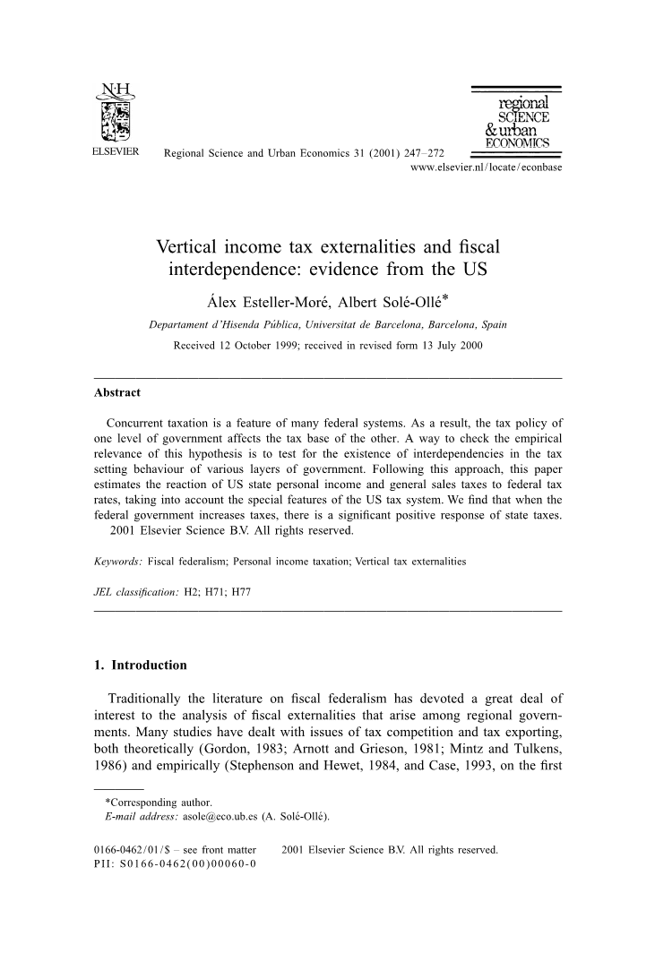 As we will discuss in the theoretical section, these contrasting results – i.e., different sign and size of the reaction – are consistent with the ambiguity of the theoretical predictions, but may also be due to differences in the taxes analysed or to differences in the federal institutional context in which tax decisions are made. We think that further empirical analysis of this kind is needed to clarify these issues. In particular, we need to know more about vertical externalities in lsquo;first classrsquo; taxes, such as the personal income tax, controlling for the institutional