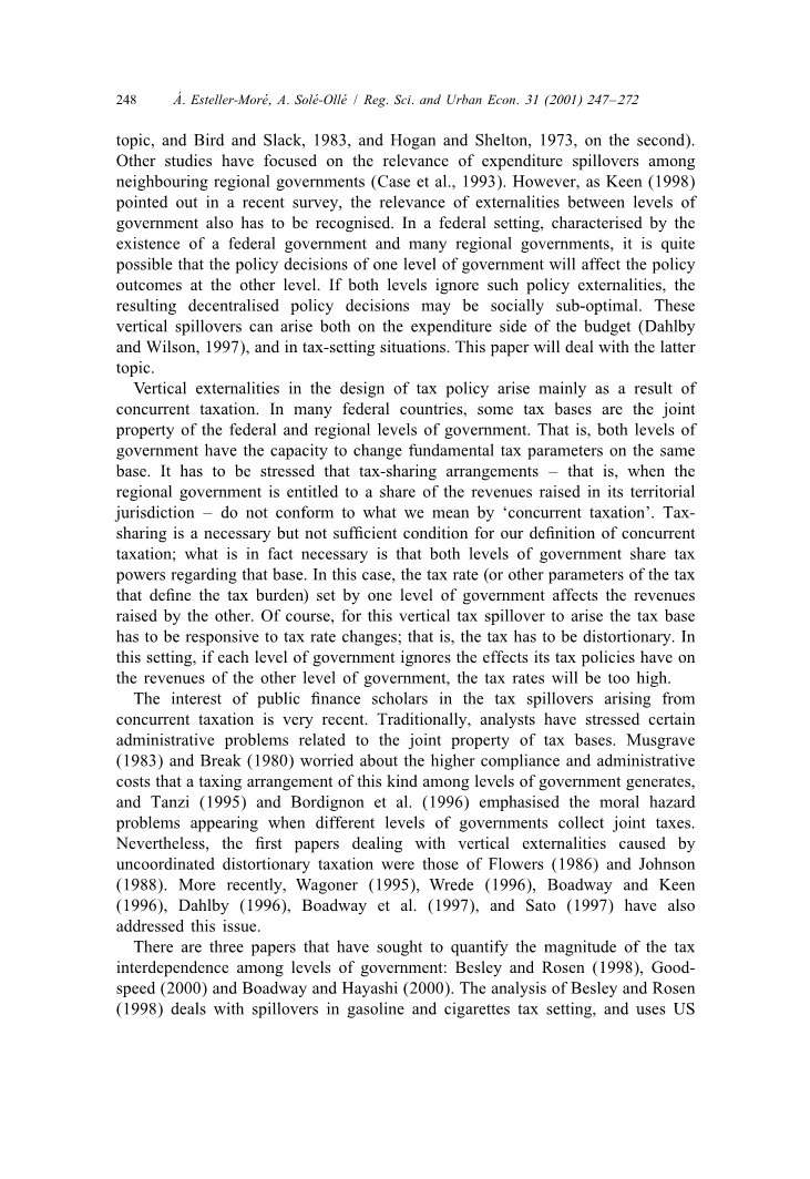 The interest of public finance scholars in the tax spillovers arising from concurrent taxation is very recent. Traditionally, analysts have stressed certain administrative problems related to the joint property of tax bases. Musgrave (1983) and Break (1980) worried about the higher compliance and administrative costs that a taxing arrangement of this kind among levels of government generates, and Tanzi (1995) and Bordignon et al. (1996) emphasised the moral hazard problems appearing when different levels of governments collect joint taxes. Nevertheless, the first papers dealing with vertical externalities caused by uncoordinated distortionary taxation were those of Flowers (1986) and Johnson (1988). More recently, Wagoner (1995), Wrede (1996), Boadway and Keen (1996), Dahlby (1996), Boadway et al. (1997), and Sato (1997) have also addressed this issue.