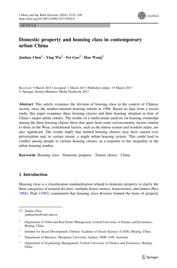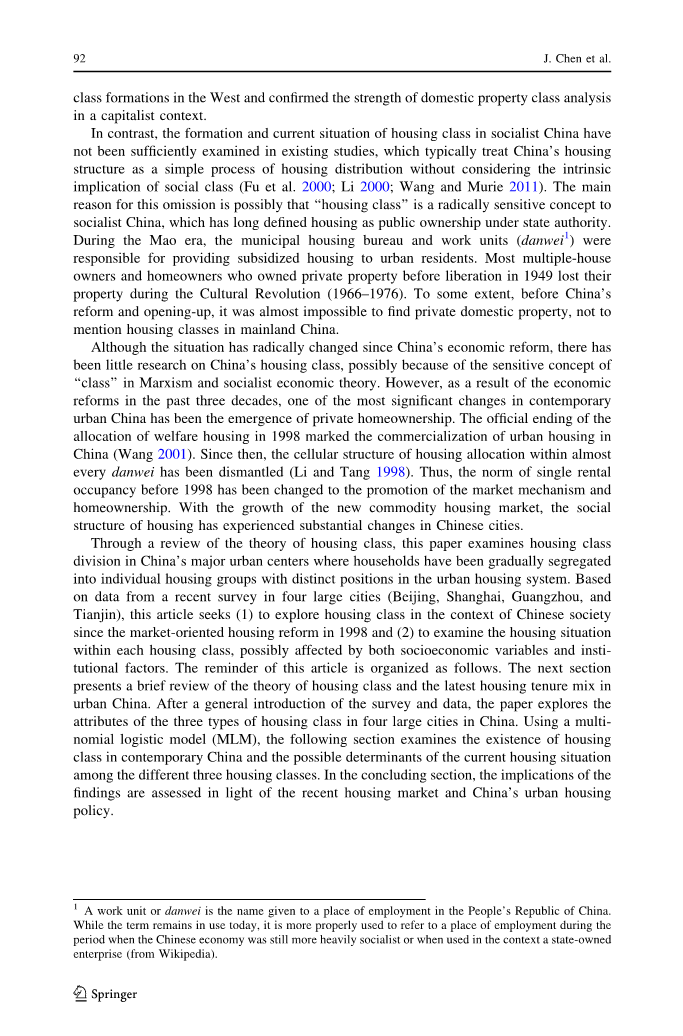 在现有研究中没有得到充分的研究,这些研究通常对待中国的住房结构作为一个简单的住房分配过程而不考虑其内在性社会阶层的含义(Fu et al。2000; Li 2000; Wang and Murie 2011)。主要的这种疏漏的原因可能是“住房阶层”是一个极端敏感的概念社会主义中国在国家权力下早已将住房界定为公有制。在毛时代,市房管局和工作单位(单位1