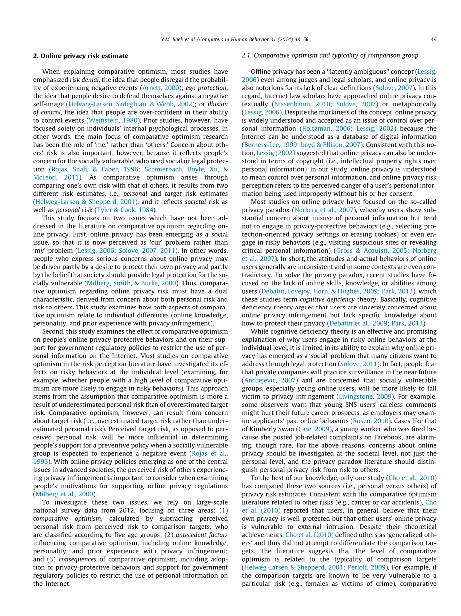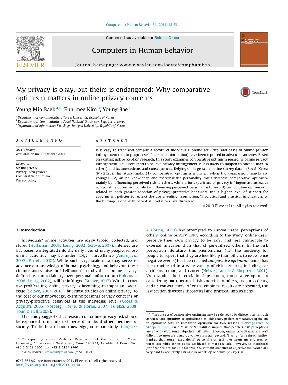 其次,本研究考察了比较乐观的效果关于人们的在线隐私保护行为以及支持政府监管政策,以限制在互联网上使用个人信息。大多数关于风险感知文献中比较乐观的研究都调查了其对个体风险行为的影响(例如,检验比较优势水平高的人是否更有可能参与危险行为)。这种方法源于这样的假设,即比较乐观主义更多是低估个人风险的结果,而不是过高估计的目标风险。然而,比较乐观主义可能是由于担心目标风险(即过高估计目标风险而非低估个人风险)。与认知的个人风险相反,感知的目标风险将更有助于确定人们对预防性政策的支持,当一个社会弱势群体预计会出现负面事件时。随着在线隐私政策成为先进社会中的核心问题之一,在检查人们支持在线隐私法规的动机时,其他人经历隐私侵权的感知风险是很重要的考虑因素。