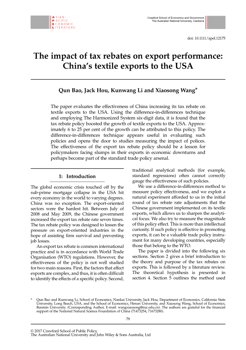 我们采用了不同的方法来衡量政策的有效性,我们利用中国政府在其纺织品出口上实施的第一轮退税率调整中所提供的一项自然实验来提高分析的重点。我们还试图测量这一现象的影响,这可不仅仅是求知欲,如果政策是促进出口的有效手段,对许多发展中国家,特别是那些属于世贸组织的国家来说,这将是一项宝贵的贸易政策工具。