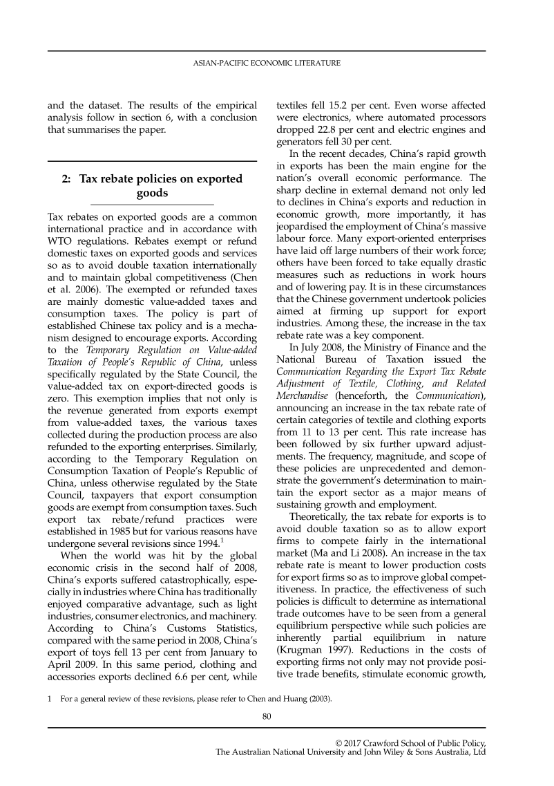 2008年7月,国务院财政部和国家税务总局联合宣布,从2008年8月1日,出口退税税率的某些纺织和服装产品从11上调至13%。纺织和服装行业包括14个类别,列为50到63下协调系统(HS)两位数分类系统。退税率为56、60、61和62的货物都提高了退税率,而57和58类货物的退税率都没有提高。至于其他八类,每一类中有一些商品的退税率提高了,而其他的则没有。这一政策是对退税政策所提出的自然实验的分析。首先,政府作为应对全球经济危机的政策工具,启动了对退税率的调整,而不是直接与绩效挂钩。