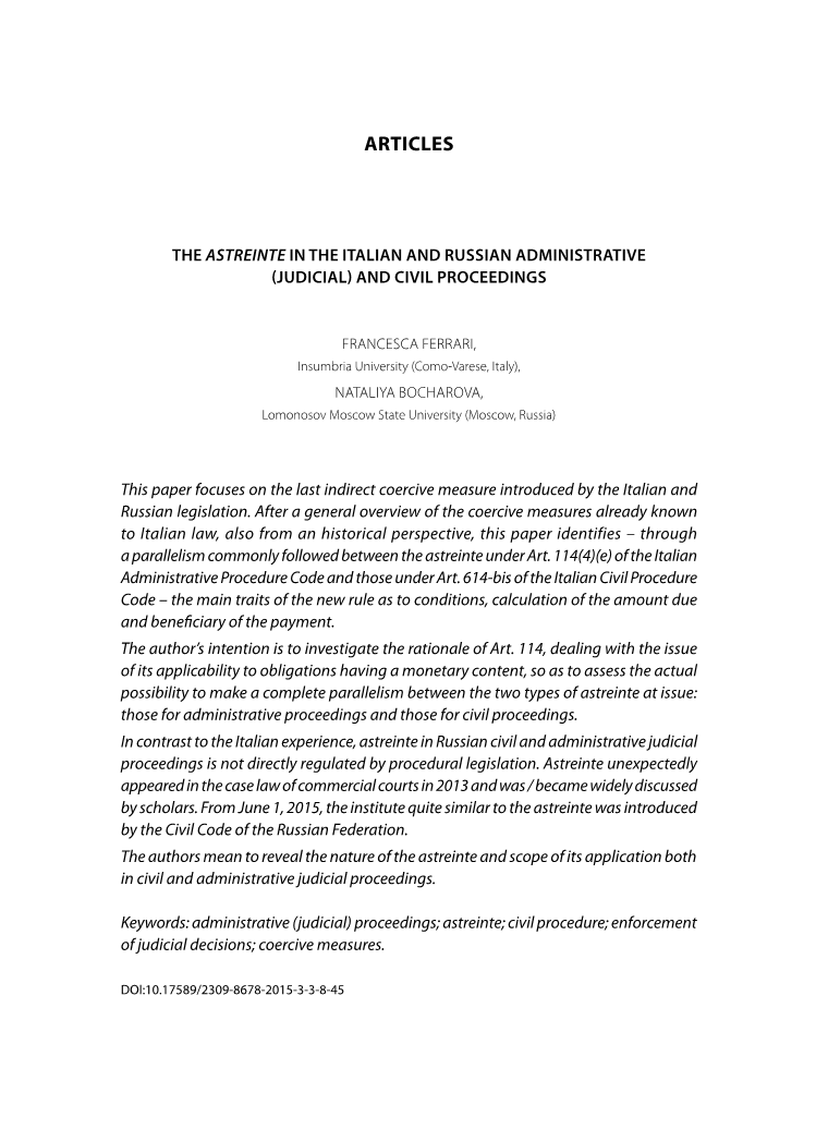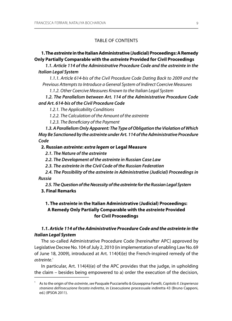 本文主要研究意大利和俄罗斯立法最新引入的一种间接强制措施,之后概述意大利法律规定的其它强制措施,并从历史的角度来研究强制措施的发展,本文件通过“意大利行政诉讼法”第114条(第四款第五项)下的执行罚与“意大利民事诉讼法”第614(第二款)规定的强制措施之间的对比分析,确定了新规则在适用条件、应付金额的计算和付款受益人方面的主要特点。