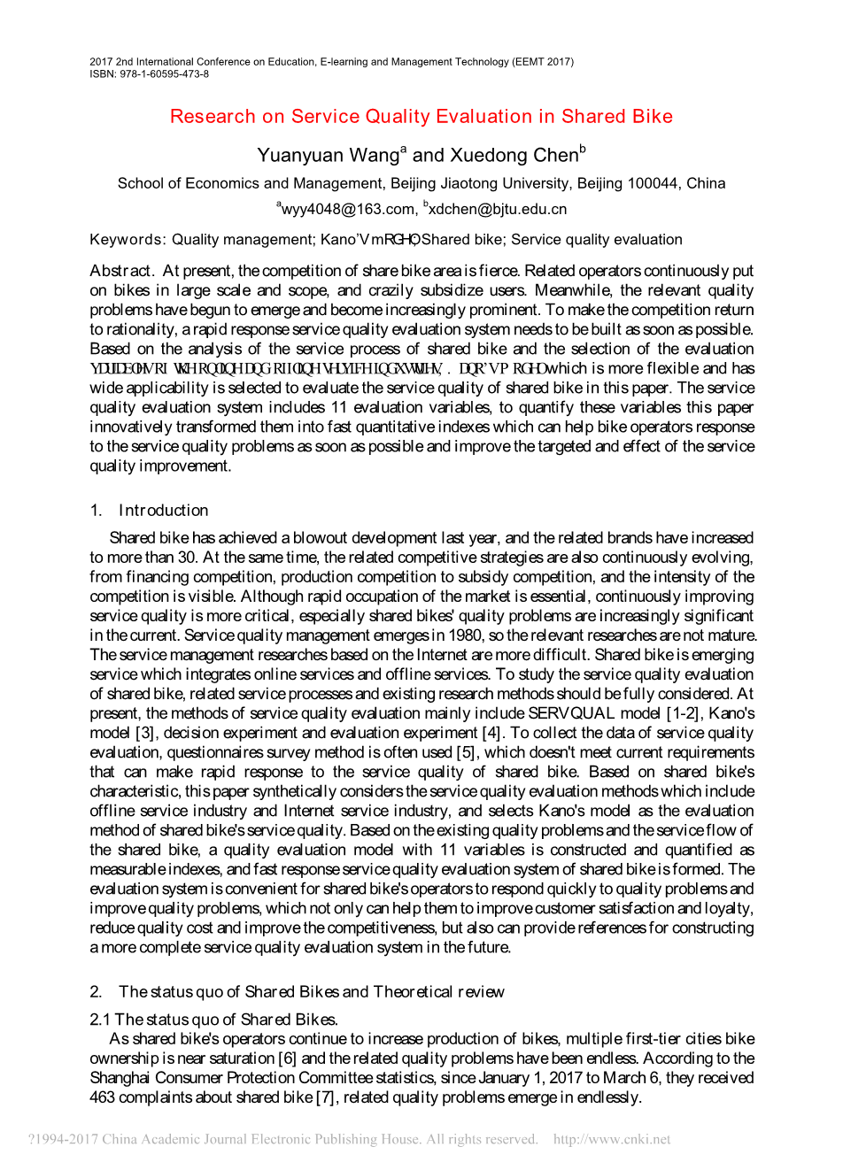 摘要:目前,共享单车领域的竞争十分激烈。相关运营商在大规模、范围内不断地投放自行车,疯狂地补贴用户。与此同时,相关的质量问题也开始显现,越来越突出。为了使竞争回归理性,需要尽快建立快速响应服务质量评价体系。基于对共享单车服务过程的分析和线上、线下服务行业评价变量的选择,选择了更灵活、适用性更广的Kano模型来评价共享自行车的服务质量。服务质量评价体系包括11个评价变量,对这些变量进行量化,创新性地将其转化为快速量化指标,可以帮助自行车运营商尽快应对服务质量问题,提高服务质量改进的目标和效果。