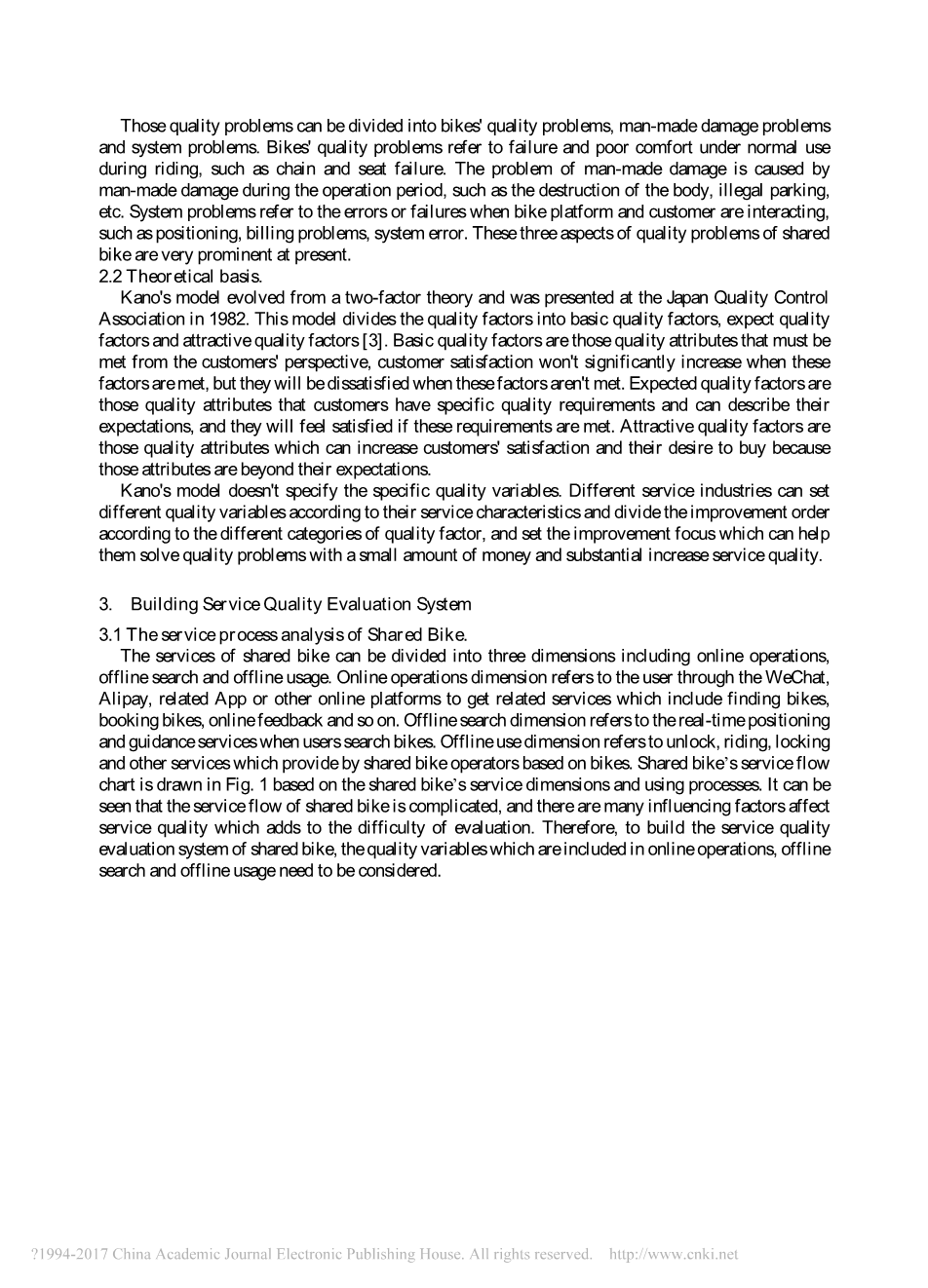共享单车去年实现了井喷式的发展,相关品牌已增加到30多家。与此同时,相关的竞争战略也在不断演变,从融资竞争、生产竞争到补贴竞争,以及竞争的激烈程度都是可见的。虽然市场的快速占领是必不可少的,但不断提高服务质量更为关键,尤其是共享单车的质量问题在当前日益突出。服务质量管理出现于1980年,相关研究尚不成熟。基于互联网的服务管理研究比较困难。共享单车是一种整合线上服务和线下服务的新兴服务。研究共享单车的服务质量评价,应充分考虑相关服务流程和现有研究方法。目前,服务质量评价方法主要包括SERVQUAL模型[1-2]、Kano模型[3]、决策实验和评价实验[4]。为了收集服务质量评价的数据,通常采用问卷调查法[5],不满足当前对共享单车服务质量快速响应的要求。本文基于共享单车的特点,综合考虑了包括线下服务行业和互联网服务行业的服务质量评价方法,选择了卡诺的模型作为共享单车服务质量的评价方法。基于现有的质量问题和共享自行车的服务流程,构建了具有11个变量的质量评价模型,并将其量化为可测量指标,形成了共享单车快速响应服务质量评价体系。评价体系能方便共享单车运营商迅速应对质量问题和改进质量问题,这不仅可以帮助他们提高客户满意度和忠诚度,降低质量成本,提高竞争力,但也可以提供参考构建一个更完整的服务质量评价体系。