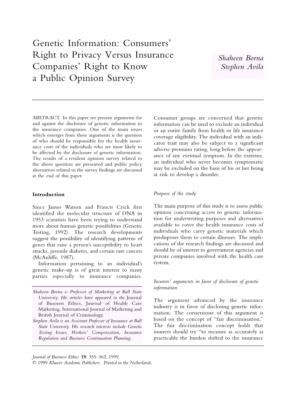 在缺乏与舆论相关的权威性研究的情况下,从服务的用户(即美国的最终消费者)那里获得了与这一主题相关的信息。所需要的信息是消费者是否愿意与保险公司分享他们的遗传信息以及他们对用不同的方法来覆盖具有可疑基因的个体的医疗保险费用的看法。这些信息与资源分配和公共政策的选择有关。考虑到这一点,1995年秋季在美国中西部城市进行了一次消费者调查。