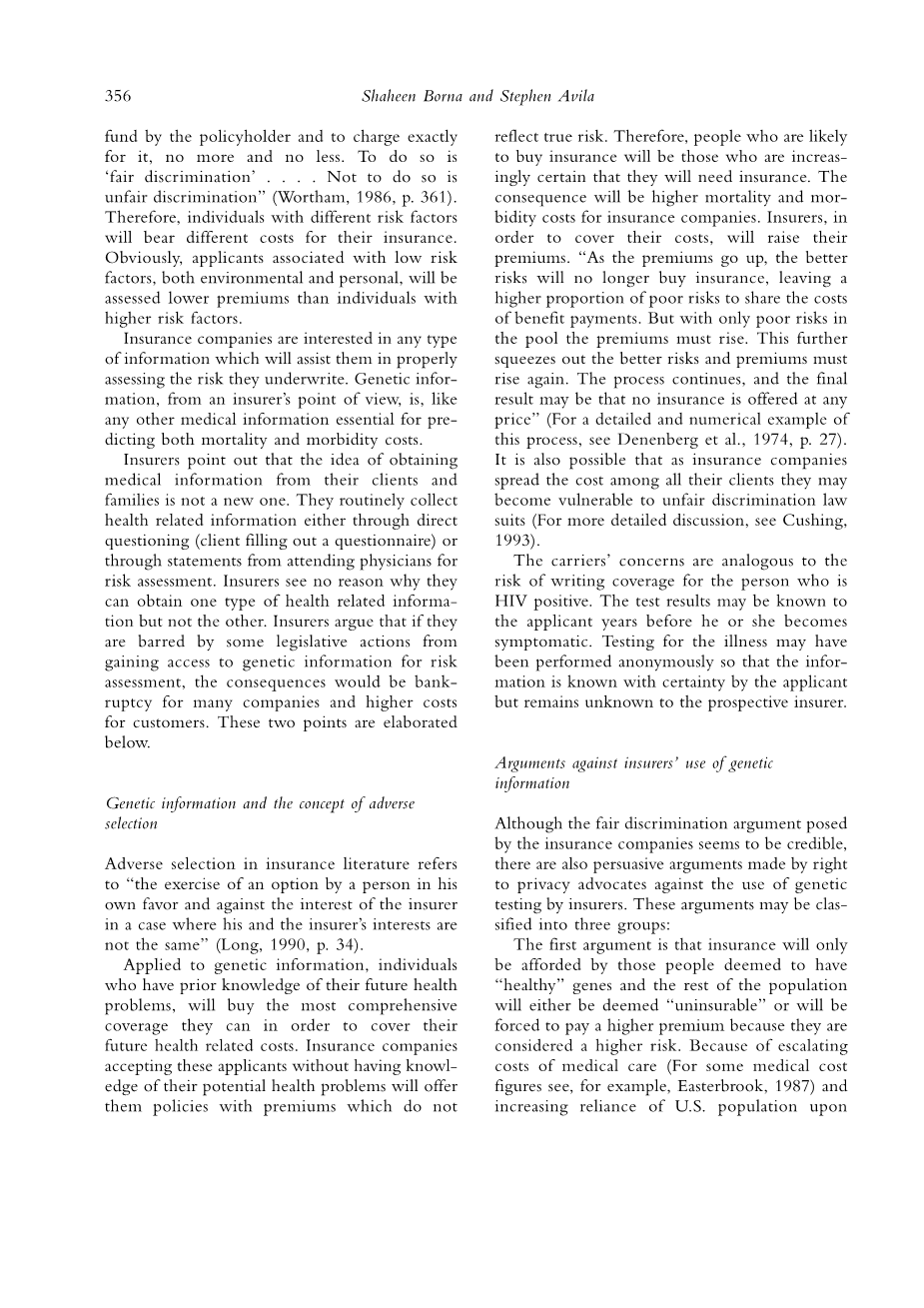 保险业提出的论点是赞成披露遗传信息。这个论点的基石是基于“公平歧视”的概念。“公平的歧视”的概念认为,保险公司应该尽可能准确地测量保单持有人转移到保险基金上的负担,并对其进行准确的收费。“这样做是lsquo;公平歧视rsquo;,hellip;不这样做是不公平的歧视“(沃斯姆,1986,第361页)。因此,具有不同风险因素的个体将为其保险承担不同的成本。很显然,与低风险因素相关的申请人,无论是环境还是个人,都将被评估为低于具有较高风险因素的个人。