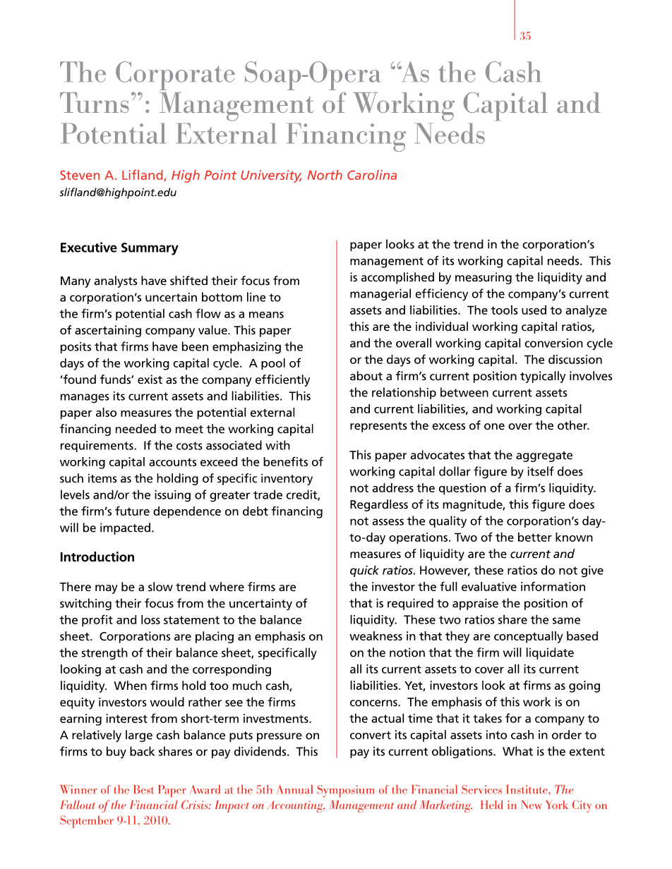 对营运资本管理的理论支撑集中在如何能让监管符合公司的短期财务需求上。本文认识到许多公司求助外部融资来满足营运资金需求并且寻找任何显著趋势的存在。本文明确地测量了2004到2009年间公司管理营运资本组成的能力。它认为在公司的营运资本组成和相应的融资之间存在紧密联系。尽管公司能提出一个可获利的盈亏结算线,然而无法从运营中产生足够的积极净现金流将会迫使管理层寻找额外的融资满足它的营运资本需要。如果与营运资本账户有关的费用超过由一些项目,诸如持有特定存货水平或发行更大的贸易信贷等带来的收益,依赖债务融资的公司的发展前景将受到影响。这将会影响利润。