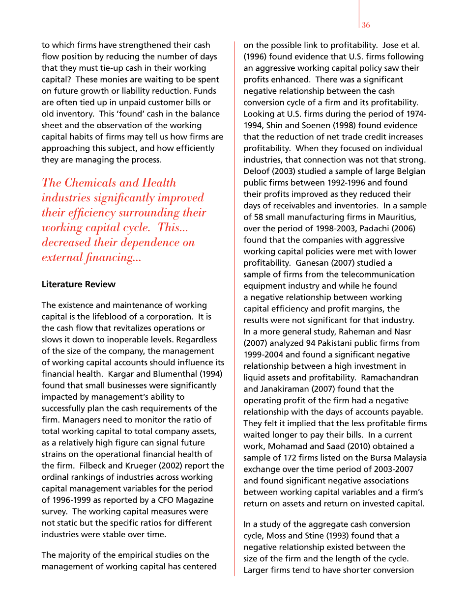 营运资本管理方面的多数实证研究都集中在和收益的可能联系上。Jose以及其他人(1996)找到了证据,美国公司在实施一种激进的营运资本政策之后,利润有所提高。公司的现金周转期和利润之间有着明显的反向关系。Shin和Soenen(1998) 在1974-1994年间关注了一些美国公司后发现,净贸易信贷的减少能增加利润。当他们把重心集中在个别的行业的时候,这种联系却不是那么密切。Deloof(2003)在1992至1996年间研究了一家大型比利时公司的样本后发现,当他们减少应收账款以及存货的天数时,利润增长了。在一个从1998持续到2003年,包含58家毛里求斯小型制造业公司的样本中,Padachi(2006) 发现采用激进营运资本政策的公司获取了较低的收益。Ganesan(2007)研究了一个由电信设备业公司组成的样本,尽管他找到了营运资本效率和利润率之间的反向关系,但结果在此种行业中却并不那么明显。在更广泛的研究中,Raheman和Nasr(2007) 从1999至2004年间分析了94个巴基斯坦的上市公司,发现高投资的流动资产和利润间存在显著的反向关系。Ramachandran和Janakiraman(2007)发现公司的经营利润和应付账款的天数成相反的关系。他们认为这意味着低盈利性企业需要等待更久的时间才能清偿债务。在一项近期的研究中,Mohamad和Saad (2010)获取了一份包含172家企业的样本,这些公司在2003-2007年间全都被列在马来西亚交易所上,他们发现营运资本变量和资产、投资资本回报之间有明显的反向关系。