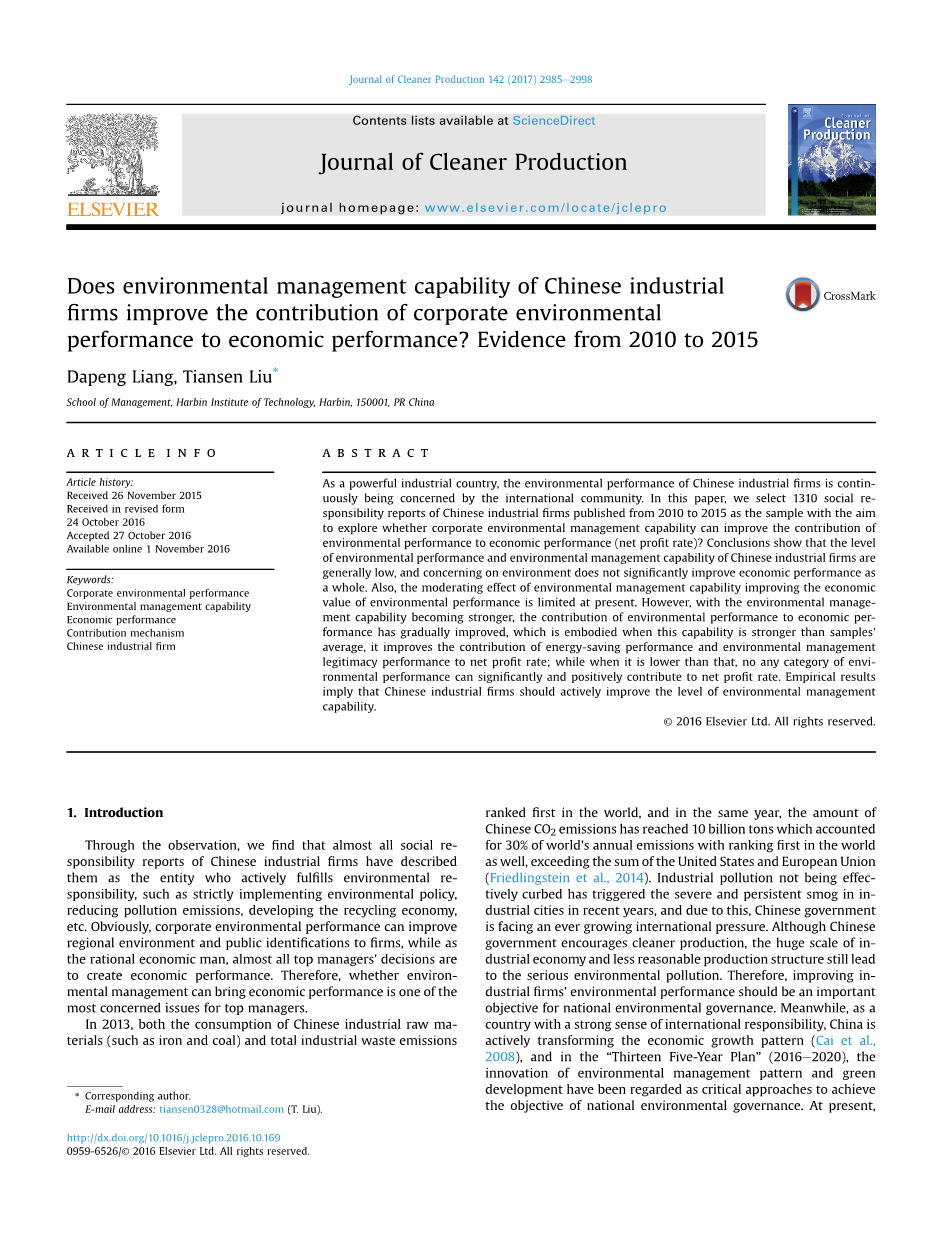 Does environmental management capability of Chinese industrial firms improve the contribution of corporate environmental performance to economic performance? Evidence from 2010 to 2015