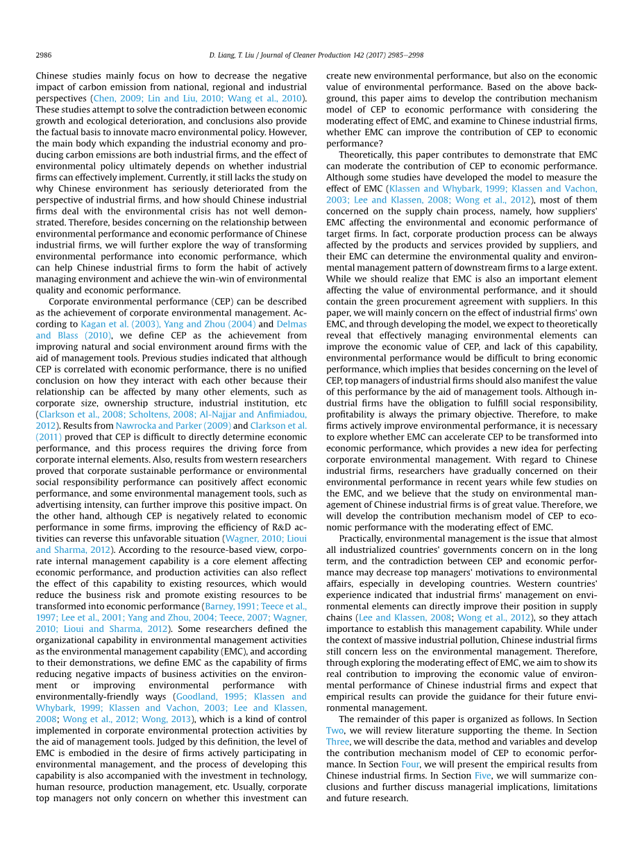 可以描述企业环境绩效(CEP)作为企业环境管理的成果。根据给Kagan等人。 (2003),Yang and Zhou(2004)和Delmas和Blass(2010),我们将CEP定义为成就改善企业周围的自然和社会环境管理工具的帮助。以前的研究表明,尽管CEP与经济表现相关,没有统一他们如何互相交流,因为他们的结论关系可能会受到许多其他因素的影响,例如企业规模,所有制结构,产业机构等(Clarkson等,2008; Scholtens,2008; Al-Najjar和Anfimiadou,2012)。 Nawrocka和Parker(2009)和Clarkson等人的结果(2011)证明CEP很难直接确定经济性能,而这个过程需要动力来自公司内部因素。此外,西方研究人员的结果证明了企业的可持续绩效或环境社会责任表现会对经济产生积极影响性能以及一些环境管理工具等广告强度,可以进一步改善这种积极影响。上另一方面,尽管CEP与经济负相关在一些企业的表现,提高研发活动的效率可以扭转这种不利的情况(Wagner,2010; Lioui和Sharma,2012)。根据资源基础来看,企业内部管理能力是影响的核心因素经济表现和生产活动也可以反映出来这种能力对现有资源的影响降低业务风险并提升现有资源转化为经济表现(Barney,1991; Teece等,1997; Lee等人,2001;杨和周,2004; Teece,2007;瓦格纳,2010; Lioui和Sharma,2012)。一些研究人员定义了这个组织环境管理活动的能力作为环境管理能力(EMC),并按照在他们的演示中,我们将EMC定义为企业的能力减少商业活动对环境的负面影响或改善环境表现环境友好的方式(Goodland,1995; Klassen和Whybark,1999; Klassen和Vachon,2003; Lee和Klassen,2008; Wong等人,2012; Wong,2013年),这是一种控制在企业环保活动中实施管理工具的帮助。根据这个定义来判断,水平EMC体现在企业积极参与的愿望中环境管理以及开发这个过程能力还伴随着技术的投入,人力资源,生产管理等。通常,企业创造新的环保表现,同时也对经济造成影响环境表现的价值。 基于以上背景,本文旨在开发贡献机制CEP模型对经济绩效的考虑EMC的调节效应,并考察中国工业企业,EMC是否可以提高CEP对经济的贡献性能?