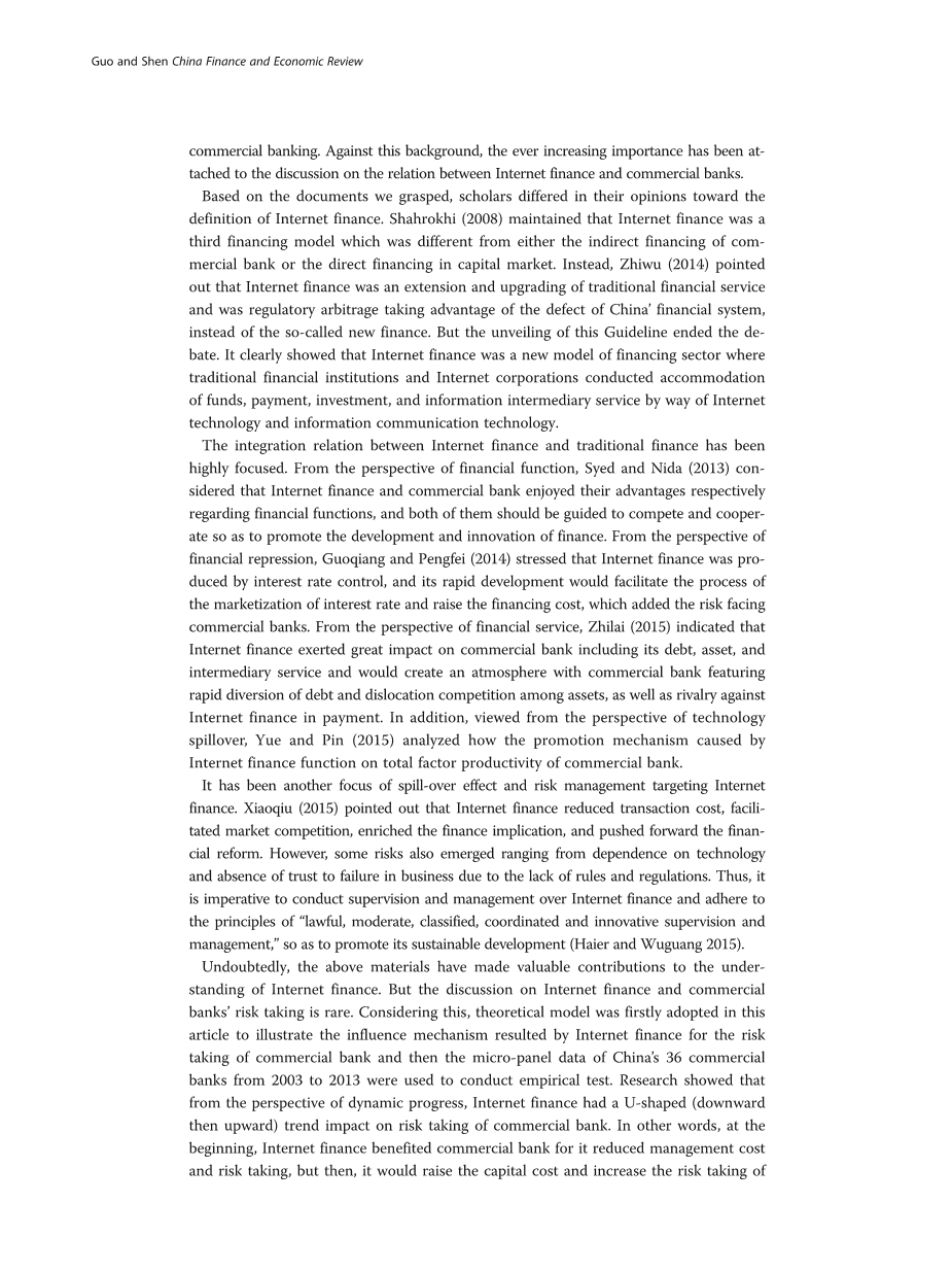 毫无疑问,上述材料为互联网金融的理解做出了宝贵的贡献。 但关于互联网金融和商业银行风险的讨论却很少。 考虑到这一点,本文首先采用理论模型来说明互联网金融对商业银行风险承担的影响机制,然后利用中国36家商业银行2003 - 2013年的微观数据进行实证检验。 研究表明,从动态的进展来看,互联网金融对商业银行的风险承受度呈U型(向下向上)趋势。 换句话说,互联网金融一开始就受益于商业银行,降低了管理成本和风险承担,但是这样会提高资金成本,增加风险承担商业银行。 从横向比较的角度来看,不同类型商业银行对互联网金融的反应风险不一样。 与中小型商业银行相比,大型银行反应迟缓。