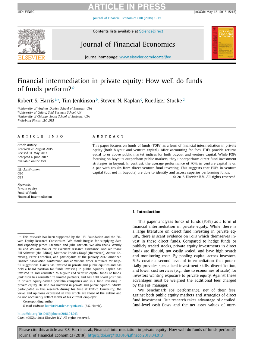 本文分析了私募股权基金作为金融中介的一种形式。虽然有大量关于直接投资私募股权的文献,但很少有证据表明FoFs自己投资于这些直接基金。与对冲基金或公开交易的股票相比,直接基金的私人股本投资缺乏流动性,不易被放大,并且具有较高的搜索和监控成本。通过将资本集中到投资者身上,FoFs创造了第二层次的中介,潜在地提供了专业的投资技巧、多样化和更低的成本服务(例如,由于规模经济),因为投资者希望投资于私人股本。针对这些优势,必须考虑FoF经理收取的额外费用。