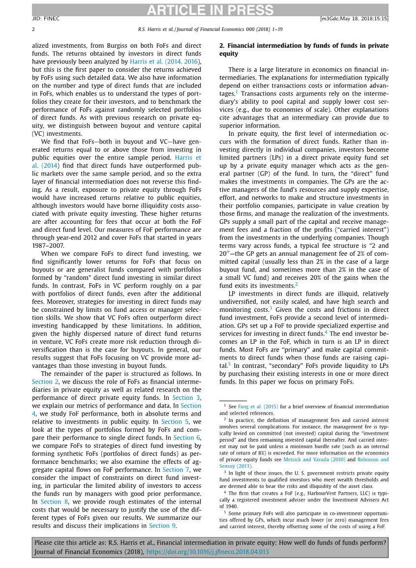 LP对直接基金的投资是缺乏流动性的,相对单一的,不容易扩展,并且有很高的搜索和监控成本。考虑到直接基金投资的成本和摩擦,FoFs提供了第二层次的中介。全球定位系统建立了一个FoF来提供专门的专门知识和服务来投资于直接资金。最终投资者在FoF中成为LP,而FoF则是直接基金的LP。大多数FoFs都是“primary”,当这些基金募集资金时,它们会对直接资金做出资本承诺。相比之下,“次级”FoFs通过在一个或多个直接基金中购买其现有的利益,为LPs提供流动性。本文主要讨论初级FoFs。在实践中,管理费用和附带权益的定义涉及几个复杂的问题。例如,管理费通常是在“投资期”期间投入的(未投资的)资本,然后剩余的投资资本。如果超过了最低的门槛率(例如8%的内部收益率),就不能支付利息。有关私人股本基金经济学的更多信息,请参见Metrick和Yasuda(2010)、Robinson和Sensoy(2013)。