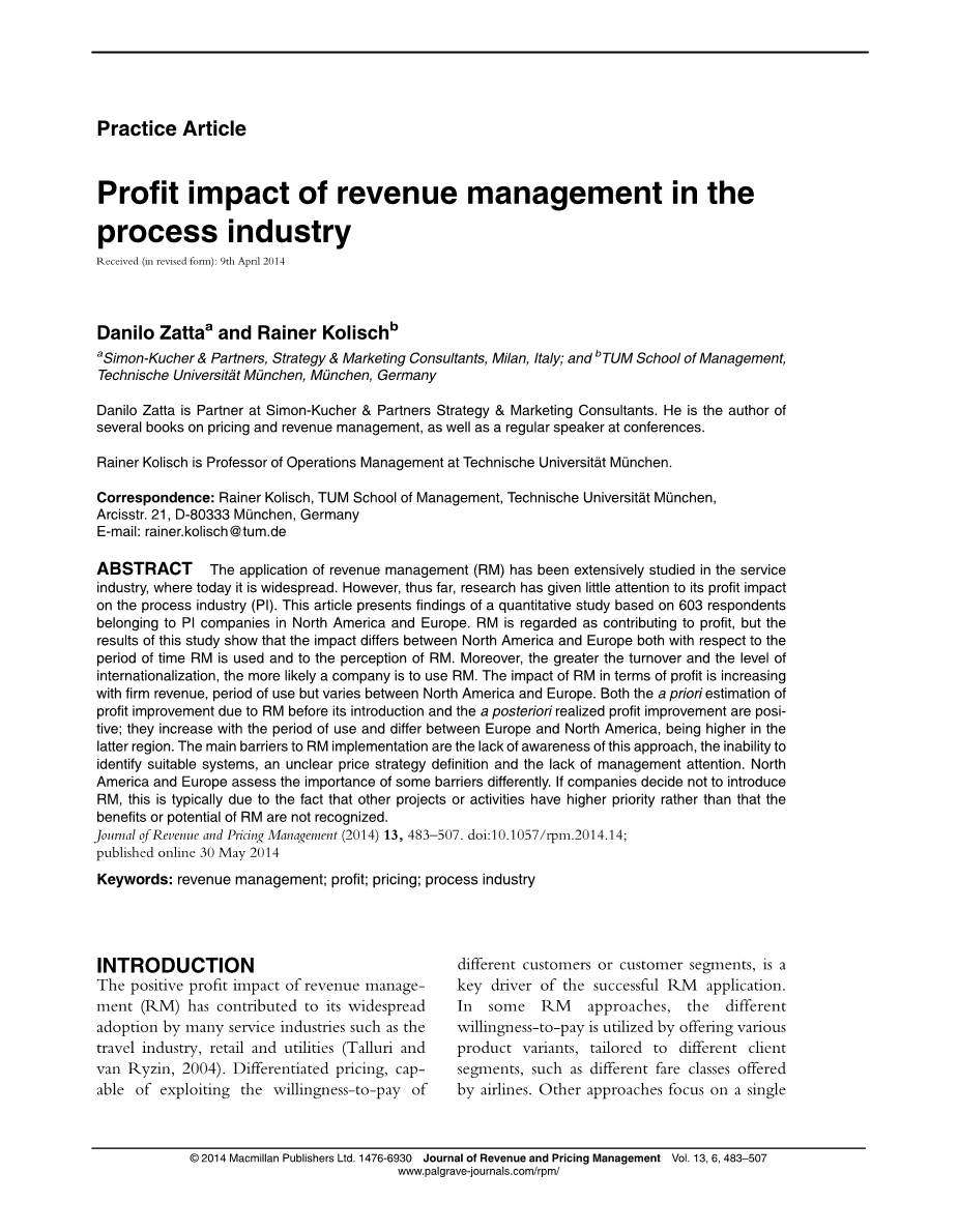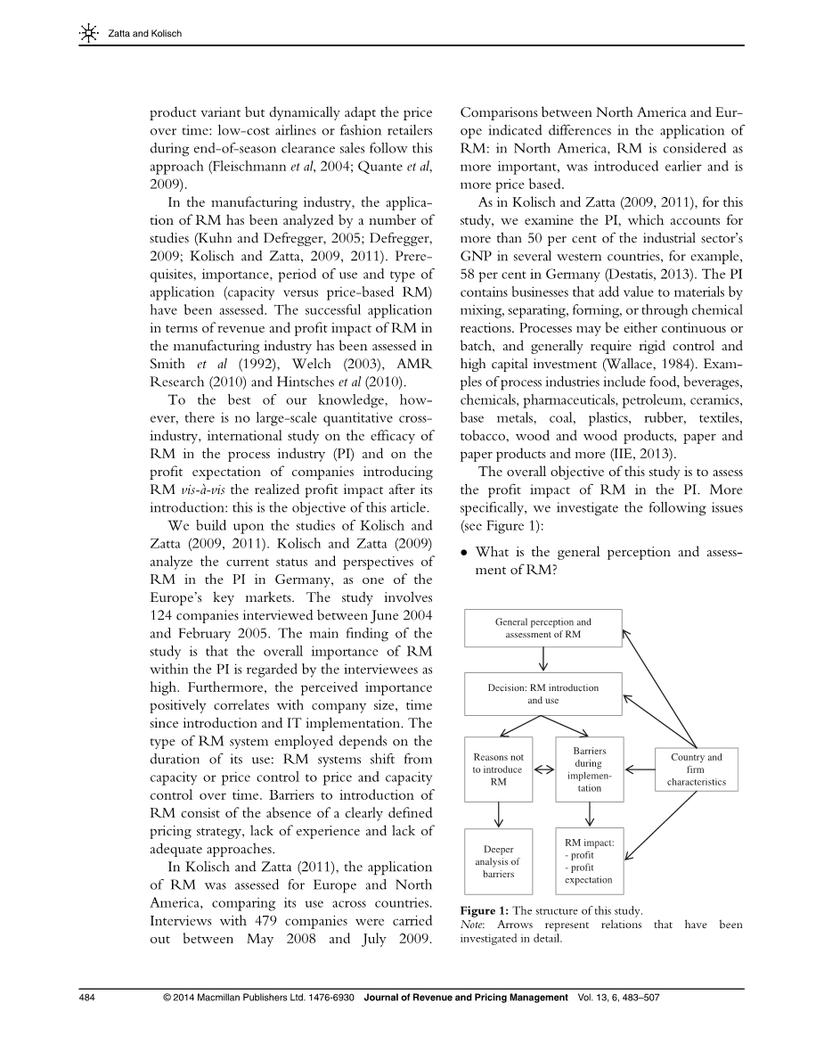 在制造业中,RM的应用被许多学者所研究(库恩和Defregger,2005年;Defregger,2009;Kolisch和Zatta,2009年,2011年)。评估了先决条件、重要性、使用期和应用类型(容量与基于价格的RM)。在史密斯等人(1992)、韦尔奇(2003)、AMR研究(2010)和Hintsches等人(2010)中,对RM在制造业的收入和利润的影响进行了评估。