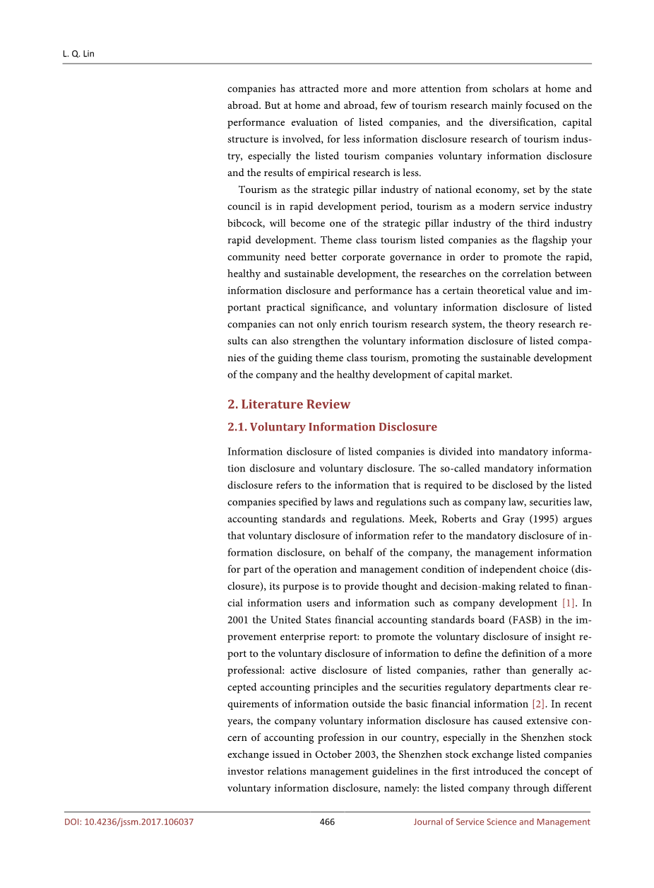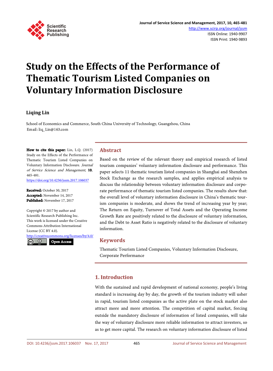 随着国民经济持续快速发展,人民生活水平不断提高,生活标准日益增加,迎来旅游业的快速上涨的同时,旅游上市公司也成为股市的活跃板块,吸引越来越多的关注。资本市场的竞争迫使除了强制公开上市公司的信息外,还会拿自愿公开更可靠信息的方式来吸引投资者,所以为了获得更多的资金。上市公司自愿披露信息研究公司吸引了越来越多的国内外学者的关注。但在国内外,旅游研究主要集中在上市公司绩效评估,涉及多元化,资本结构等方面,对于旅游业披露信息研究较少,特别是上市旅游企业自愿披露信息的研究较少,而且实证研究的结果较少。