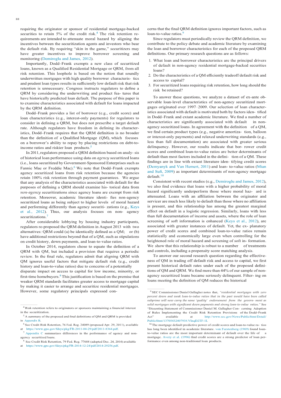 在金融危机之后,国会通过了2010年多德-弗兰克华尔街改革和消费者保护法案(以下简称Dodd-Frank),要求监管机构颁布规则,要求住宅抵押贷款支持证券的发起人或发起人保留5 %的信用风险.4风险保留要求旨在通过调整证券化代理与承担违约风险的投资者之间的激励来减轻道德风险。通过要求“风险公担”,证券化机构可能会有更大的动机来改善借款人的筛选和监控(Demiroglu and James,2012)。