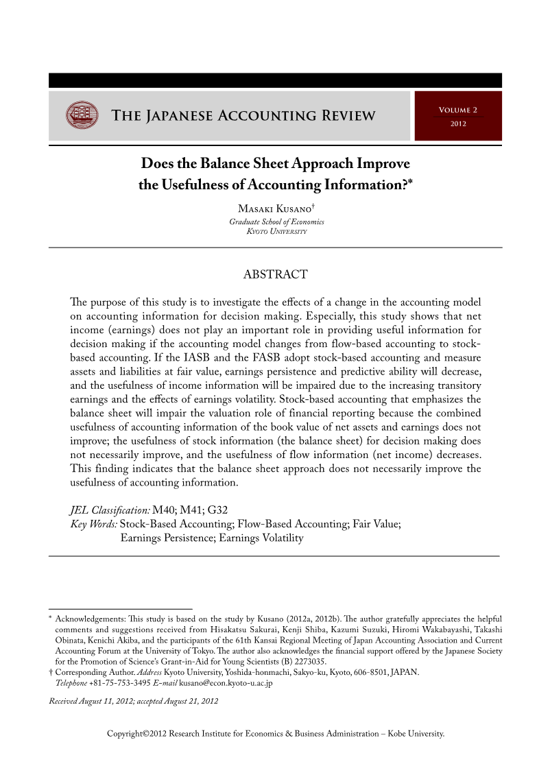 基于流量的会计使用收入报表作为提供有用会计信息进行决策的主要工具。 它假设投资者预测未来流量(如未来收益和未来现金流量)与当前收益并估算股权价值(O#39;Brien,2009)。 投资者非常重视经常性和高度持续性的收益,对非经常性和短暂性收益的价值较低(Obinata,2011,第271-272页)。目前的收入平均而言是未来收入的指标(Penman,2003,第90页),因此它表明高度持续收入对未来流量具有较高的预测能力。由于周期性收益预计会成为长期收益或正常收益趋势的指标,因此需要消除与评估持续绩效无关的事件的财务影响所需的费用(日本会计评论,2(2012),139-152),并且只对长期影响绩效的事件的财务影响进行平均(FASB,1976年,第62段)。因此,在流动会计下,收入计量的目标是确定净收入(收益),而不是全面收入。