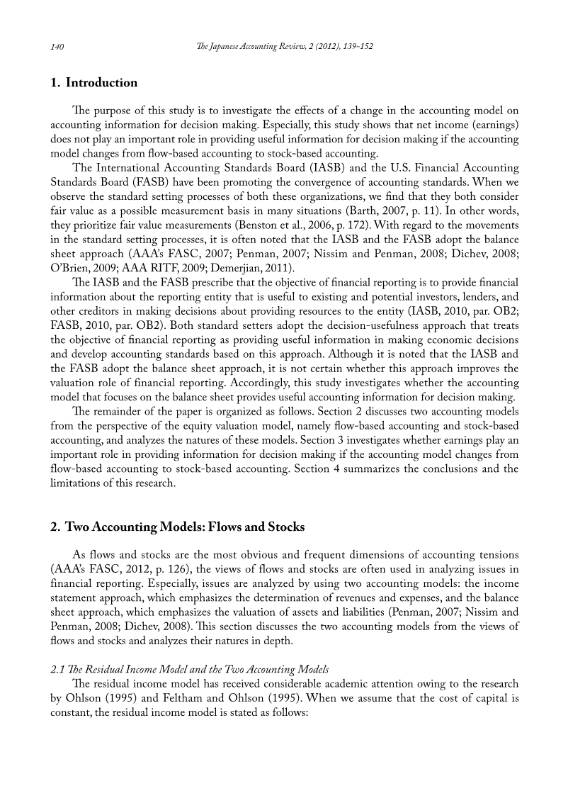 因此,在实际情况下,当我们采用剩余收益模型作为商业评估模型时,我们必须同时使用净资产和收入来估计股权价值(Ohlson和Zhang,1998)。当基于流量和股票的理想会计模型被放置在任何一端时,真正的会计模型都存在于两者之间。我们可以假设不同的会计模型,重点关注投资者和分析师关注的“两个”底线“数字,股本(股票)账面价值和收益(流量)”(Nissim and Penman,2008,p.10)。 换句话说,可以通过将“收益和[净资产]账面价值”等总结数据(Black,1993,p。3)作为最终底线来获得两种不同的会计模型。在下一小节中,本研究调查了以流动为基础的会计,其侧重于损益表,以股票为基础的会计,从流动和股票角度着眼于资产负债表。