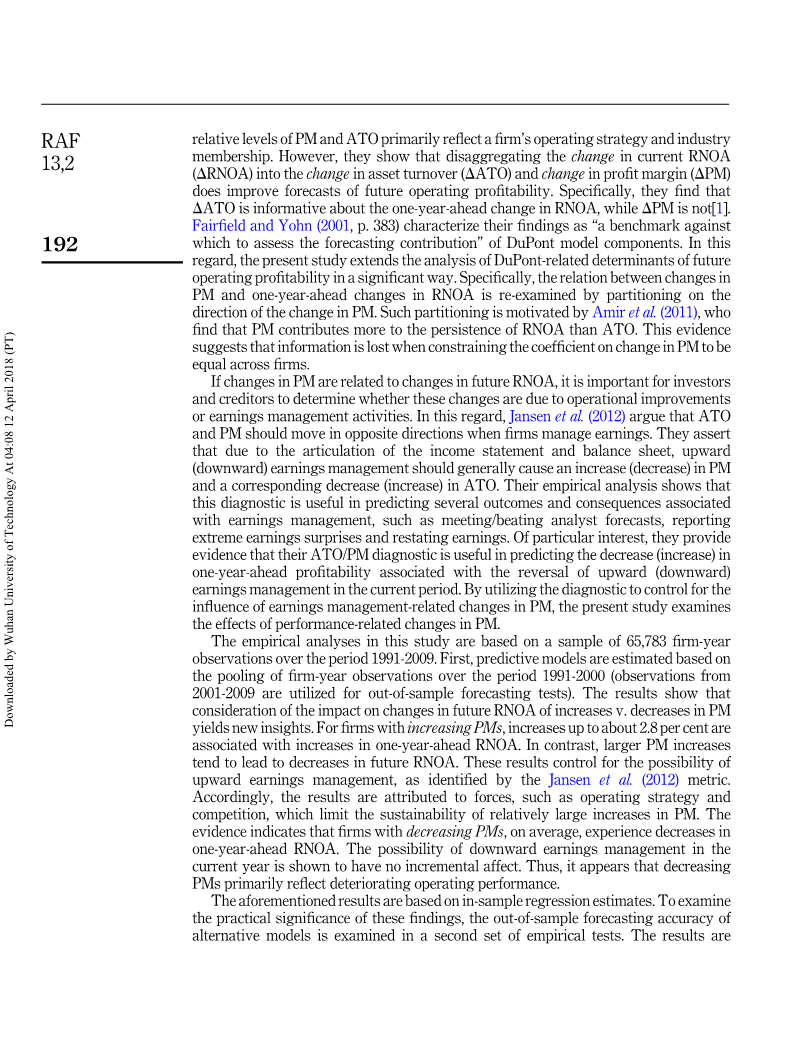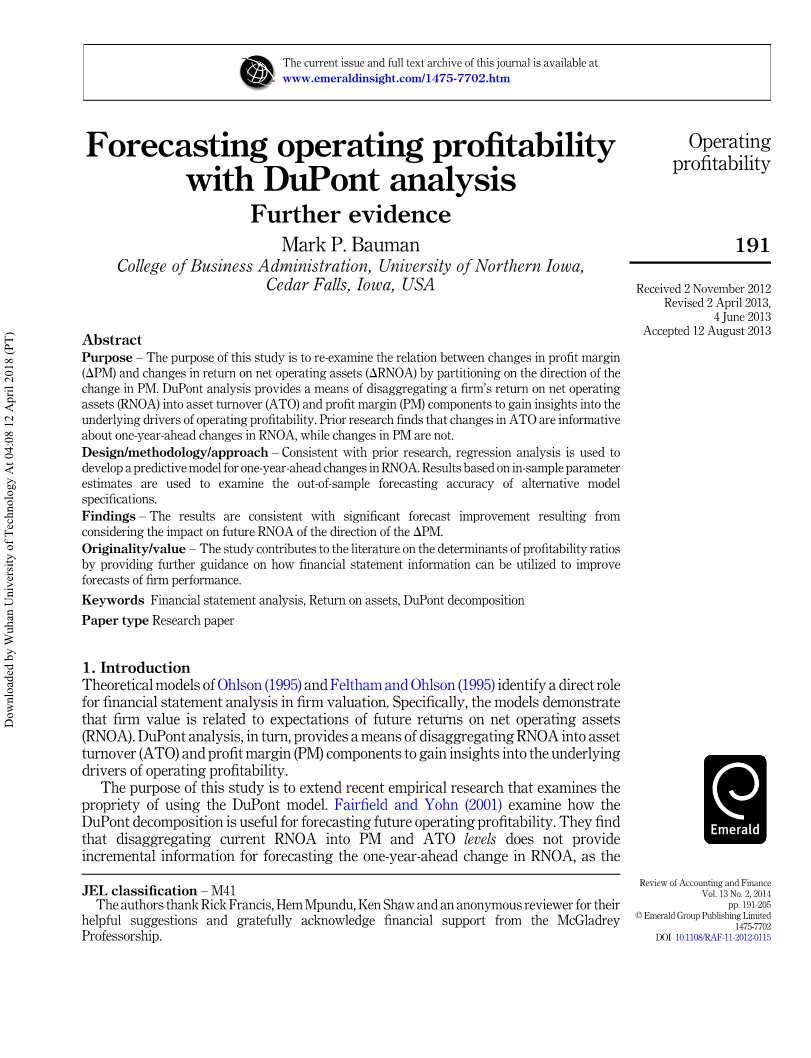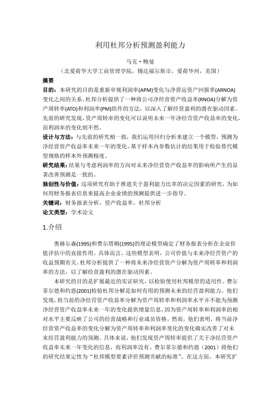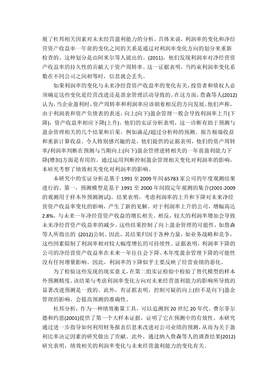 基于改进杜邦分析法的云南白药盈利能力分析外文翻译资料 2022-07-12 14:24:03 英语原文共 16 页,剩余内容已隐藏,支付完成后下载完整资料 英语原文共 7 页,剩余内容已隐藏,支付完成后下载完整资料资料编号:[9642],资料为PDF文档或Word文档,PDF文档可免费转换为Word 原文和译文剩余内容已隐藏,您需要先支付 30元 才能查看原文和译文全部内容!立即支付 发小红书推广免费获取该资料资格。点击链接进入获取推广文案即可: Ai一键组稿 | 降AI率 | 降重复率 | 论文一键排版 PREVIOUS NEXT 您可能感兴趣的文章 哈佛分析框架下的企业经营管理分析:以迪斯尼公司为例外文翻译资料 某些财务指标对罗马尼亚能源部门股本回报率的影响——基于Dupont分析的竞争方法外文翻译资料 企业并购中的金融风险控制与规避措施外文翻译资料 马来西亚公司的企业风险管理做法外文翻译资料 伊斯兰金融机制下的中小企业融资困境分析——以苏丹伊斯兰银行为例外文翻译资料 塞尔维亚肉类行业盈利能力分析外文翻译资料 现金流量表与企业价值:来自台湾的证据外文翻译资料 企业价值最大化视角下的财务风险控制与防范研究外文翻译资料 财务报表舞弊的原因、后果及防范外文翻译资料 澳大利亚借壳上市:探索性分析外文翻译资料