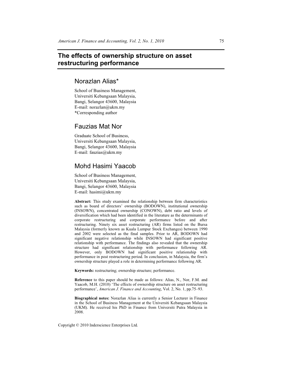 摘要:本研究考察了企业特征之间的关系,例如董事会的所有权(BODOWN)、机构投资者所有权(INSOWN)、集中所有权(CONOWN)、债务比率和多样化水平,这些在文献中被确定为重组前后公司重组和公司业绩的决定因素。1990年至2002年期间,在马来西亚Bursa(前身为吉隆坡证券交易所)上市的96家资产重组(AR)公司被选为最终样本。在资产重组之前,董事会所有权与绩效有显著的负相关关系,而机构投资者所有权与绩效有显著的正相关关系。研究结果还表明,随着资产重组,股权结构与绩效有显著的关系。但在后期的重组过程中,只有董事会所有权与绩效有显著的正相关关系。综上所述,在马来西亚,公司的所有权结构决定了公司的业绩。